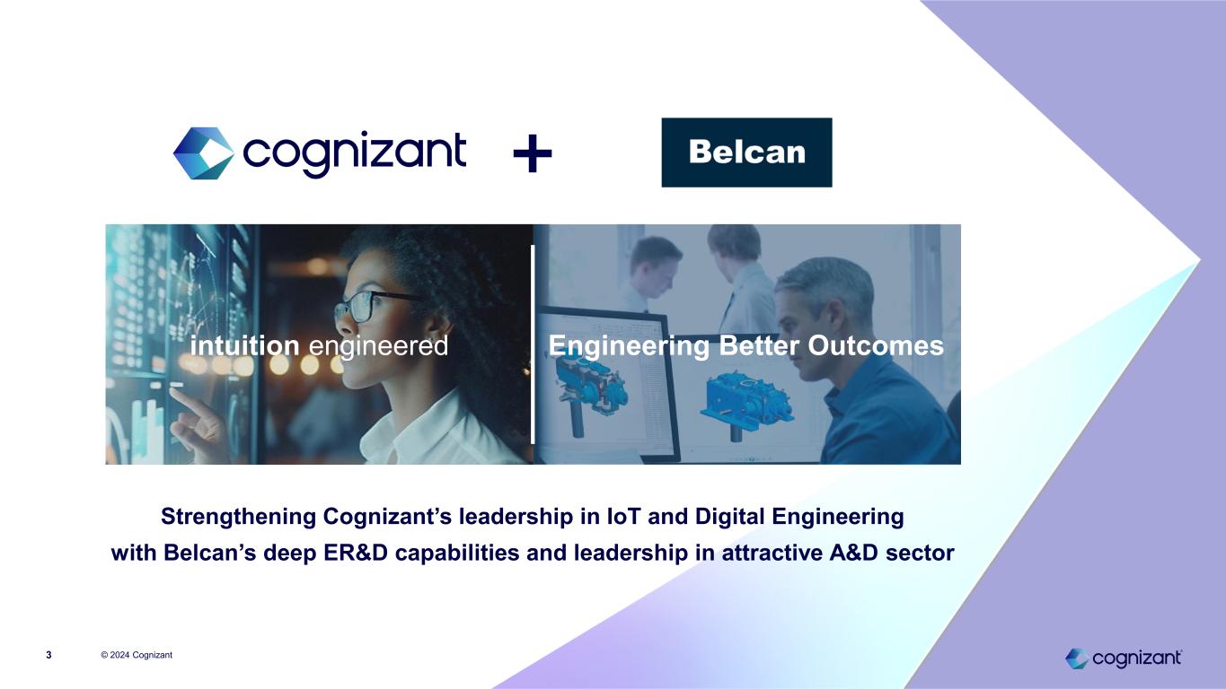 Forward-looking statements © 2024 Cognizant2 This presentation includes statements that may constitute forward-looking statements made pursuant to the safe harbor provisions of the Private Securities Litigation Reform Act of 1995, the accuracy of which is necessarily subject to risks, uncertainties and assumptions as to future events that may not prove to be accurate. These statements include, but are not limited to, express or implied forward-looking statements relating to the anticipated growth of the ER&D services market; the benefits of the proposed transaction between us and Propulsion Holdings, LLC (“Belcan")(the indirect parent of Belcan, LLC), including the impact of the acquisition of Belcan on the business and prospects of both Cognizant and Belcan, including revenue, synergies, new business opportunities, growth, expansion and the anticipated impact of the transaction on our future financial and operating results; the expecting timing of the transaction closing; the combined company's plans, objectives, expectations and intentions, including the contemplated increase in Cognizant’s share repurchase plan; and other statements that are not historical facts. These statements are neither promises nor guarantees, but are subject to a variety of risks and uncertainties, many of which are beyond our control, which could cause actual results to differ materially from those contemplated in these forward-looking statements. Existing and prospective investors are cautioned not to place undue reliance on these forward-looking statements, which speak only as of the date hereof. Factors that could cause actual results to differ materially from those expressed or implied include the risk that the revenue synergies and any cost savings from the transaction may not be fully realized or may take longer than anticipated to be realized; disruption to the parties' businesses as a result of the announcement and pendency of the transaction; the ability by each of Cognizant and Belcan to obtain required governmental approvals of the transaction on the timeline expected, or at all, and the risk that such approvals may result in the imposition of conditions that could adversely affect us after the closing of the transaction or adversely affect the expected benefits of the transaction; reputational risk and the reaction of each company's customers, suppliers, employees or other business partners to the transaction; the failure of the closing conditions in the merger agreement to be satisfied, or any unexpected delay in closing the transaction or the occurrence of any event, change or other circumstances that could give rise to the termination of the merger agreement; the possibility that the transaction may be more expensive to complete than anticipated, including as a result of unexpected factors or events; risks related to management and oversight of the expanded business and operations of Cognizant following the transaction due to the increased size and complexity of its business; the possibility of increased scrutiny by, and/or additional regulatory requirements of, governmental authorities as a result of the transaction; the risk that combining Belcan's business and operations into Cognizant will be more costly or difficult than expected, or that we are otherwise unable to successfully integrate Belcan's businesses with our own, including as a result of unexpected factors or events; and general competitive, economic, political and market conditions and other factors that may affect our future results or that of Belcan, including general economic conditions, the competitive and rapidly changing nature of the markets we compete in, the competitive marketplace for talent and its impact on employee recruitment and retention, our ability to successfully implement our NextGen program and the amount of costs, timing of incurring costs and ultimate benefits of such plans, our ability to successfully use AI-based technologies, legal, reputational and financial risks resulting from cyberattacks, changes in the regulatory environment, including with respect to immigration and taxes. Additional factors which could affect future results are discussed in our most recent Annual Report on Form 10-K and other filings with the Securities and Exchange Commission. Cognizant undertakes no obligation to update or revise any forward-looking statements, whether as a result of new information, future events, or otherwise, except as may be required under applicable securities law.