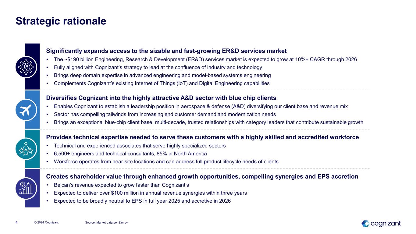 © 2024 Cognizant3 Engineering Better Outcomesintuition engineered Strengthening Cognizant’s leadership in IoT and Digital Engineering with Belcan’s deep ER&D capabilities and leadership in attractive A&D sector