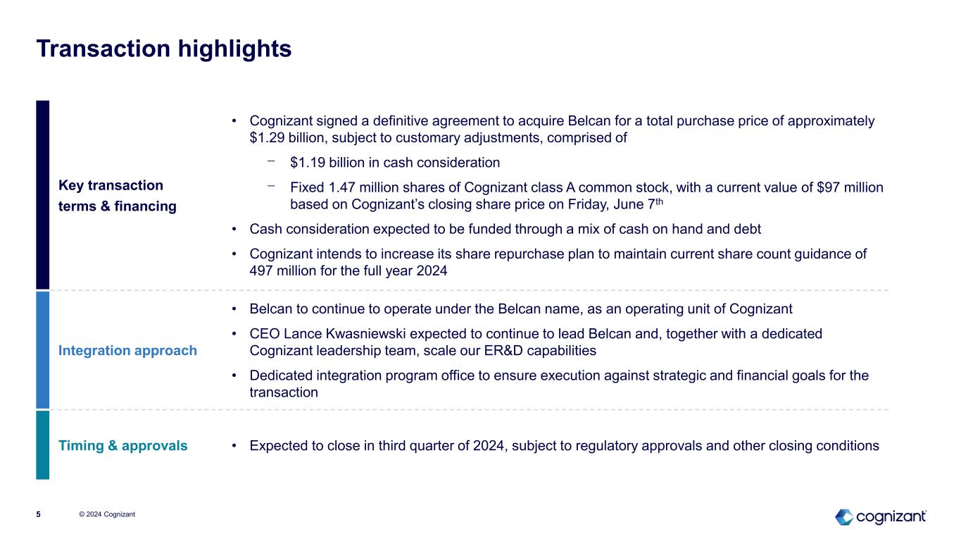 Strategic rationale © 2024 Cognizant4 Significantly expands access to the sizable and fast-growing ER&D services market • The ~$190 billion Engineering, Research & Development (ER&D) services market is expected to grow at 10%+ CAGR through 2026 • Fully aligned with Cognizant’s strategy to lead at the confluence of industry and technology • Brings deep domain expertise in advanced engineering and model-based systems engineering • Complements Cognizant’s existing Internet of Things (IoT) and Digital Engineering capabilities Diversifies Cognizant into the highly attractive A&D sector with blue chip clients • Enables Cognizant to establish a leadership position in aerospace & defense (A&D) diversifying our client base and revenue mix • Sector has compelling tailwinds from increasing end customer demand and modernization needs • Brings an exceptional blue-chip client base; multi-decade, trusted relationships with category leaders that contribute sustainable growth Provides technical expertise needed to serve these customers with a highly skilled and accredited workforce • Technical and experienced associates that serve highly specialized sectors • 6,500+ engineers and technical consultants, 85% in North America • Workforce operates from near-site locations and can address full product lifecycle needs of clients Creates shareholder value through enhanced growth opportunities, compelling synergies and EPS accretion • Belcan’s revenue expected to grow faster than Cognizant’s • Expected to deliver over $100 million in annual revenue synergies within three years • Expected to be broadly neutral to EPS in full year 2025 and accretive in 2026 Source: Market data per Zinnov.