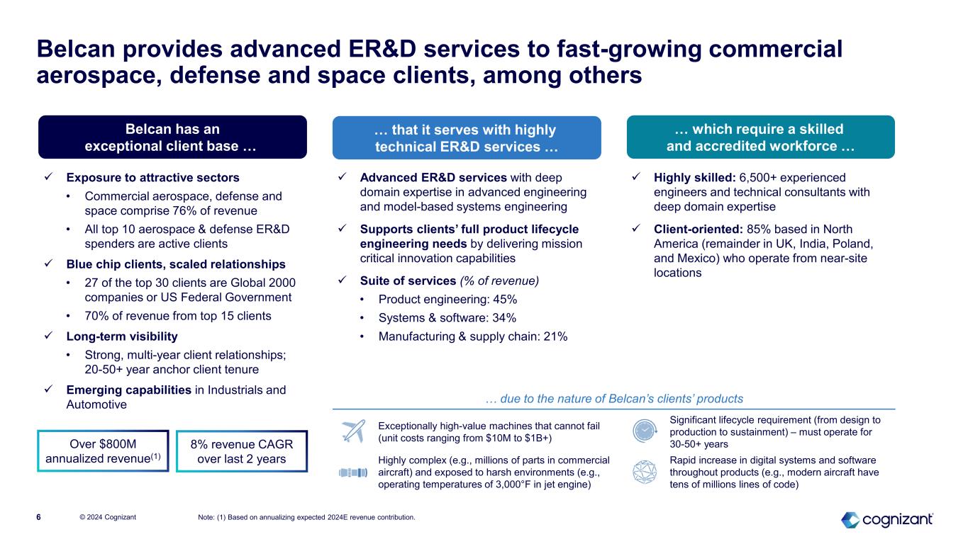 Transaction highlights © 2024 Cognizant5 Key transaction terms & financing • Cognizant signed a definitive agreement to acquire Belcan for a total purchase price of approximately $1.29 billion, subject to customary adjustments, comprised of ⎻ $1.19 billion in cash consideration ⎻ Fixed 1.47 million shares of Cognizant class A common stock, with a current value of $97 million based on Cognizant’s closing share price on Friday, June 7th • Cash consideration expected to be funded through a mix of cash on hand and debt • Cognizant intends to increase its share repurchase plan to maintain current share count guidance of 497 million for the full year 2024 Integration approach • Belcan to continue to operate under the Belcan name, as an operating unit of Cognizant • CEO Lance Kwasniewski expected to continue to lead Belcan and, together with a dedicated Cognizant leadership team, scale our ER&D capabilities • Dedicated integration program office to ensure execution against strategic and financial goals for the transaction Timing & approvals • Expected to close in third quarter of 2024, subject to regulatory approvals and other closing conditions