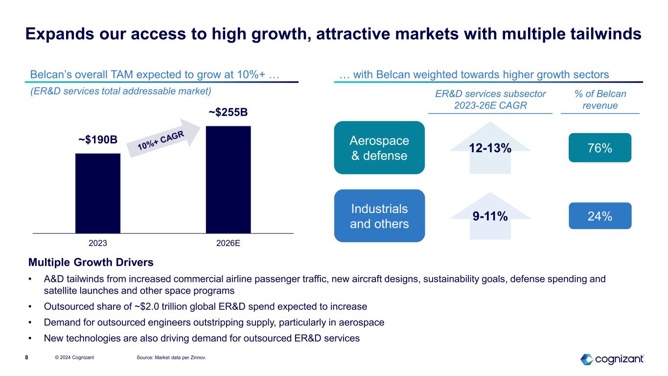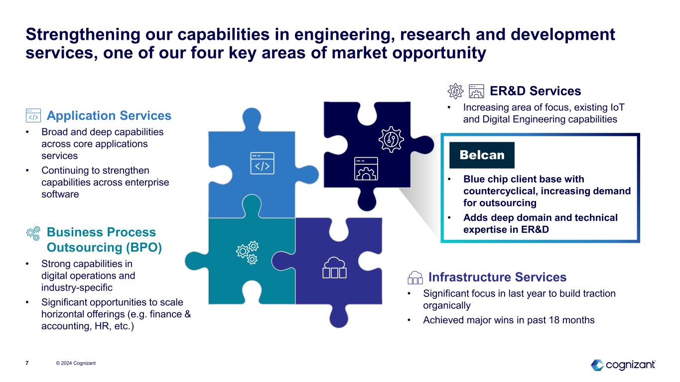 Belcan provides advanced ER&D services to fast-growing commercial aerospace, defense and space clients, among others © 2024 Cognizant6  Exposure to attractive sectors • Commercial aerospace, defense and space comprise 76% of revenue • All top 10 aerospace & defense ER&D spenders are active clients  Blue chip clients, scaled relationships • 27 of the top 30 clients are Global 2000 companies or US Federal Government • 70% of revenue from top 15 clients  Long-term visibility • Strong, multi-year client relationships; 20-50+ year anchor client tenure  Emerging capabilities in Industrials and Automotive  Highly skilled: 6,500+ experienced engineers and technical consultants with deep domain expertise  Client-oriented: 85% based in North America (remainder in UK, India, Poland, and Mexico) who operate from near-site locations  Advanced ER&D services with deep domain expertise in advanced engineering and model-based systems engineering  Supports clients’ full product lifecycle engineering needs by delivering mission critical innovation capabilities  Suite of services (% of revenue) • Product engineering: 45% • Systems & software: 34% • Manufacturing & supply chain: 21% Belcan has an exceptional client base … … that it serves with highly technical ER&D services … … which require a skilled and accredited workforce … … due to the nature of Belcan’s clients’ products Exceptionally high-value machines that cannot fail (unit costs ranging from $10M to $1B+) Highly complex (e.g., millions of parts in commercial aircraft) and exposed to harsh environments (e.g., operating temperatures of 3,000°F in jet engine) Significant lifecycle requirement (from design to production to sustainment) – must operate for 30-50+ years Rapid increase in digital systems and software throughout products (e.g., modern aircraft have tens of millions lines of code) Over $800M annualized revenue(1) 8% revenue CAGR over last 2 years Note: (1) Based on annualizing expected 2024E revenue contribution.