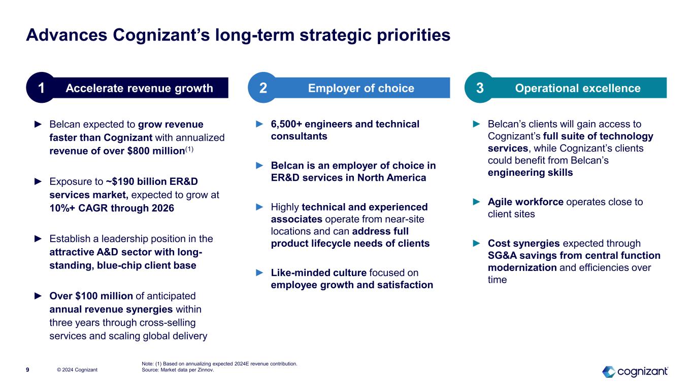 Expands our access to high growth, attractive markets with multiple tailwinds © 2024 Cognizant8 2023 2026E Belcan’s overall TAM expected to grow at 10%+ … (ER&D services total addressable market) ~$255B Multiple Growth Drivers • A&D tailwinds from increased commercial airline passenger traffic, new aircraft designs, sustainability goals, defense spending and satellite launches and other space programs • Outsourced share of ~$2.0 trillion global ER&D spend expected to increase • Demand for outsourced engineers outstripping supply, particularly in aerospace • New technologies are also driving demand for outsourced ER&D services … with Belcan weighted towards higher growth sectors Aerospace & defense 12-13% Industrials and others 9-11% 76% 24% ~$190B ER&D services subsector 2023-26E CAGR % of Belcan revenue Source: Market data per Zinnov.