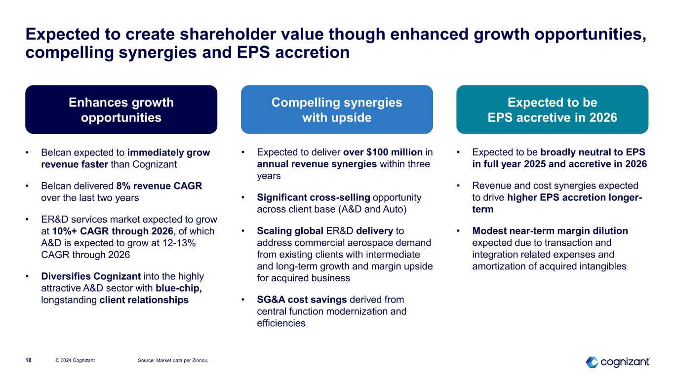 Note: (1) Based on annualizing expected 2024E revenue contribution. Source: Market data per Zinnov. Advances Cognizant’s long-term strategic priorities © 2024 Cognizant9 ► Belcan expected to grow revenue faster than Cognizant with annualized revenue of over $800 million(1) ► Exposure to ~$190 billion ER&D services market, expected to grow at 10%+ CAGR through 2026 ► Establish a leadership position in the attractive A&D sector with long- standing, blue-chip client base ► Over $100 million of anticipated annual revenue synergies within three years through cross-selling services and scaling global delivery Accelerate revenue growth Employer of choice Operational excellence ► 6,500+ engineers and technical consultants ► Belcan is an employer of choice in ER&D services in North America ► Highly technical and experienced associates operate from near-site locations and can address full product lifecycle needs of clients ► Like-minded culture focused on employee growth and satisfaction ► Belcan’s clients will gain access to Cognizant’s full suite of technology services, while Cognizant’s clients could benefit from Belcan’s engineering skills ► Agile workforce operates close to client sites ► Cost synergies expected through SG&A savings from central function modernization and efficiencies over time 1 32