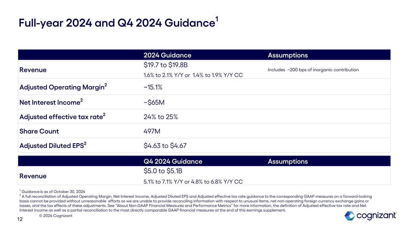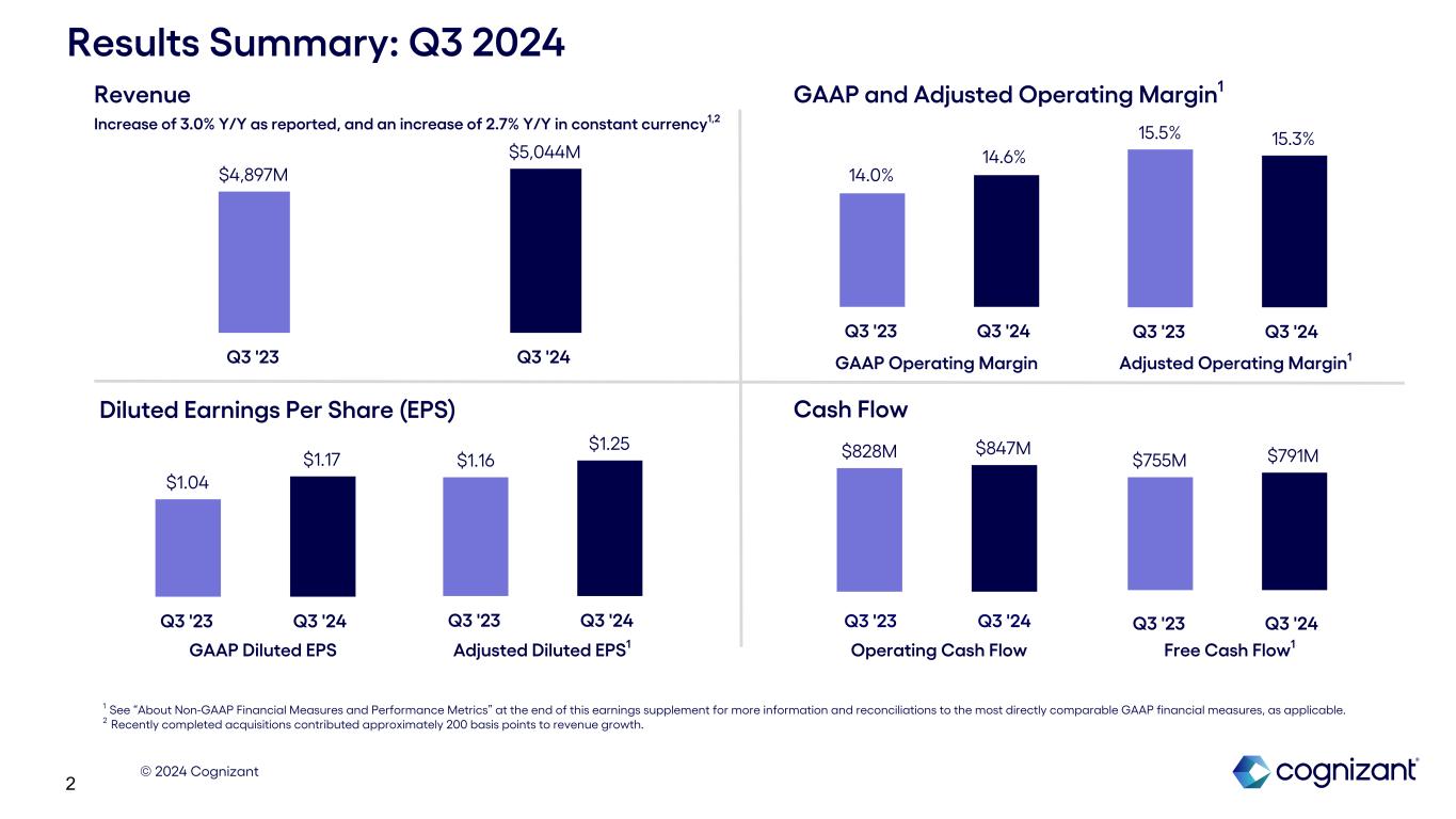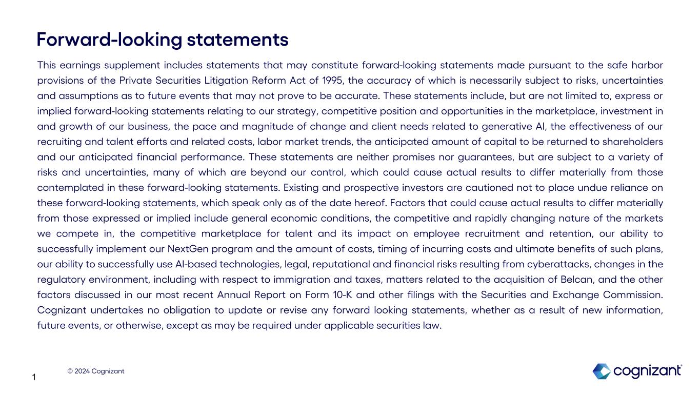 © 2024 Cognizant 1 Forward-looking statements This earnings supplement includes statements that may constitute forward-looking statements made pursuant to the safe harbor provisions of the Private Securities Litigation Reform Act of 1995, the accuracy of which is necessarily subject to risks, uncertainties and assumptions as to future events that may not prove to be accurate. These statements include, but are not limited to, express or implied forward-looking statements relating to our strategy, competitive position and opportunities in the marketplace, investment in and growth of our business, the pace and magnitude of change and client needs related to generative AI, the effectiveness of our recruiting and talent efforts and related costs, labor market trends, the anticipated amount of capital to be returned to shareholders and our anticipated financial performance. These statements are neither promises nor guarantees, but are subject to a variety of risks and uncertainties, many of which are beyond our control, which could cause actual results to differ materially from those contemplated in these forward-looking statements. Existing and prospective investors are cautioned not to place undue reliance on these forward-looking statements, which speak only as of the date hereof. Factors that could cause actual results to differ materially from those expressed or implied include general economic conditions, the competitive and rapidly changing nature of the markets we compete in, the competitive marketplace for talent and its impact on employee recruitment and retention, our ability to successfully implement our NextGen program and the amount of costs, timing of incurring costs and ultimate benefits of such plans, our ability to successfully use AI-based technologies, legal, reputational and financial risks resulting from cyberattacks, changes in the regulatory environment, including with respect to immigration and taxes, matters related to the acquisition of Belcan, and the other factors discussed in our most recent Annual Report on Form 10-K and other filings with the Securities and Exchange Commission. Cognizant undertakes no obligation to update or revise any forward looking statements, whether as a result of new information, future events, or otherwise, except as may be required under applicable securities law.