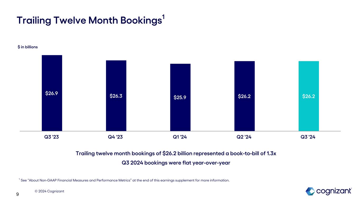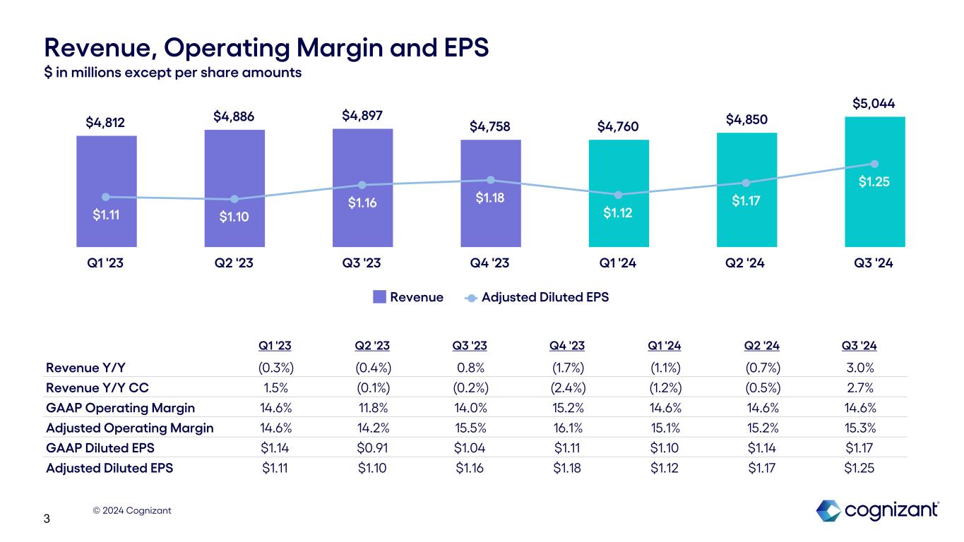 © 2024 Cognizant 2 $828M $847M Results Summary: Q3 2024 1 See “About Non-GAAP Financial Measures and Performance Metrics” at the end of this earnings supplement for more information and reconciliations to the most directly comparable GAAP financial measures, as applicable. 2 Recently completed acquisitions contributed approximately 200 basis points to revenue growth. Revenue Increase of 3.0% Y/Y as reported, and an increase of 2.7% Y/Y in constant currency1,2 GAAP and Adjusted Operating Margin1 Cash Flow $4,897M $5,044M Q3 '23 Q3 '24 14.0% 14.6% Q3 '23 Q3 '24 15.5% 15.3% Q3 '23 Q3 '24 $755M $791M Q3 '23 Q3 '24 $1.04 $1.17 Q3 '23 Q3 '24 $1.16 $1.25 Q3 '23 Q3 '24 Adjusted Operating Margin1 GAAP Diluted EPS Adjusted Diluted EPS1 Operating Cash Flow Free Cash Flow1 GAAP Operating Margin Adjusted Operating Margin1 Diluted Earnings Per Share (EPS) Q3 '23 Q3 '24