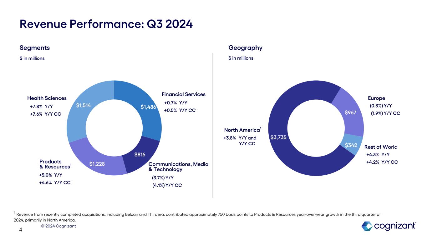 © 2024 Cognizant 3 $4,812 $4,886 $4,897 $4,758 $4,760 $4,850 $5,044 $1.11 $1.10 $1.16 $1.18 $1.12 $1.17 $1.25 Revenue Adjusted Diluted EPS Q1 '23 Q2 '23 Q3 '23 Q4 '23 Q1 '24 Q2 '24 Q3 '24 $ in millions except per share amounts Q1 '23 Q2 '23 Q3 '23 Q4 '23 Q1 '24 Q2 '24 Q3 '24 Revenue Y/Y (0.3%) (0.4%) 0.8% (1.7%) (1.1%) (0.7%) 3.0% Revenue Y/Y CC 1.5% (0.1%) (0.2%) (2.4%) (1.2%) (0.5%) 2.7% GAAP Operating Margin 14.6% 11.8% 14.0% 15.2% 14.6% 14.6% 14.6% Adjusted Operating Margin 14.6% 14.2% 15.5% 16.1% 15.1% 15.2% 15.3% GAAP Diluted EPS $1.14 $0.91 $1.04 $1.11 $1.10 $1.14 $1.17 Adjusted Diluted EPS $1.11 $1.10 $1.16 $1.18 $1.12 $1.17 $1.25 Revenue, Operating Margin and EPS 1