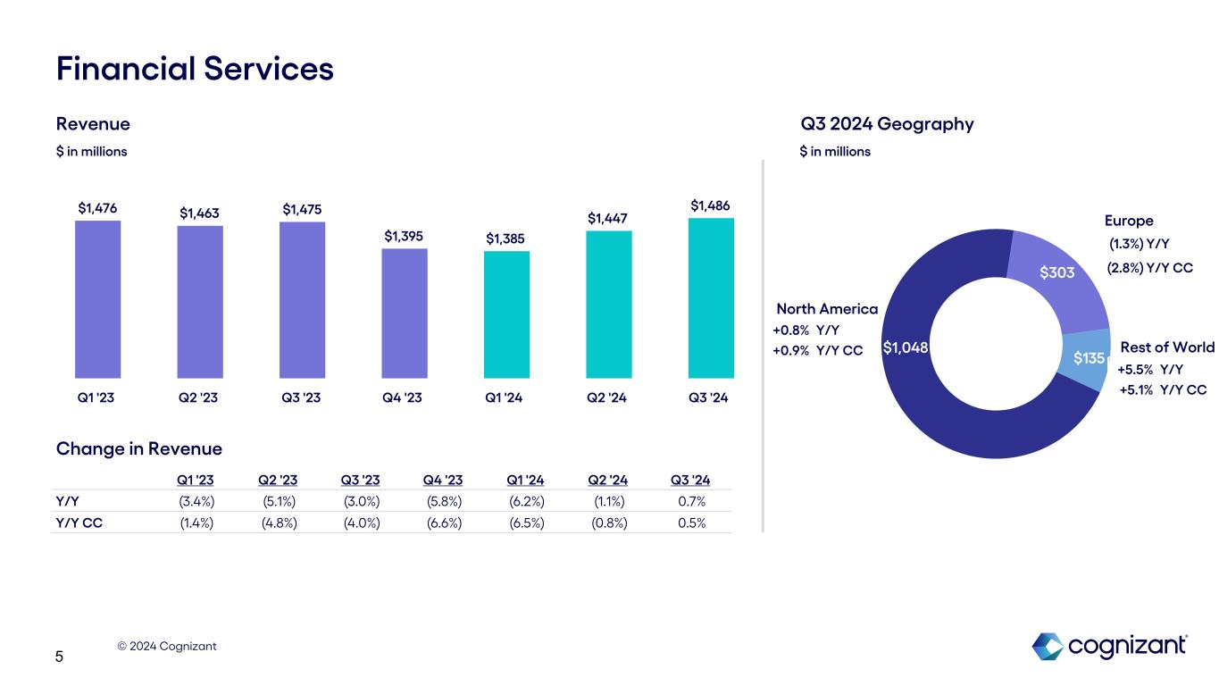 © 2024 Cognizant 4 $3,735 $967 $342 $1,486 $816 $1,228 $1,514 Revenue Performance: Q3 2024 Products & Resources1 Communications, Media & Technology Health Sciences Financial Services North America1 Europe Rest of World Segments $ in millions Geography $ in millions (3.7%) Y/Y (4.1%) Y/Y CC +5.0% Y/Y +4.6% Y/Y CC +7.8% Y/Y +7.6% Y/Y CC +0.7% Y/Y +0.5% Y/Y CC (0.3%) Y/Y (1.9%) Y/Y CC +4.3% Y/Y +4.2% Y/Y CC +3.8% Y/Y and Y/Y CC 1 Revenue from recently completed acquisitions, including Belcan and Thirdera, contributed approximately 750 basis points to Products & Resources year-over-year growth in the third quarter of 2024, primarily in North America.