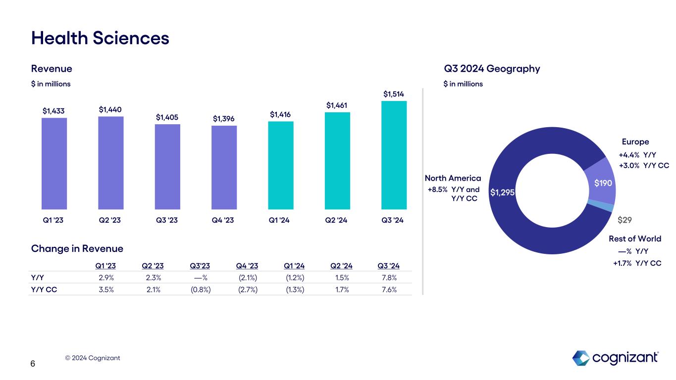 © 2024 Cognizant 5 $1,048 $303 $135 Financial Services North America Europe Rest of World Q1 '23 Q2 '23 Q3 '23 Q4 '23 Q1 '24 Q2 '24 Q3 '24 Y/Y (3.4%) (5.1%) (3.0%) (5.8%) (6.2%) (1.1%) 0.7% Y/Y CC (1.4%) (4.8%) (4.0%) (6.6%) (6.5%) (0.8%) 0.5% +5.5% Y/Y +5.1% Y/Y CC (1.3%) Y/Y (2.8%) Y/Y CC Revenue Change in Revenue $ in millions $ in millions Q3 2024 Geography +0.8% Y/Y +0.9% Y/Y CC $1,476 $1,463 $1,475 $1,395 $1,385 $1,447 $1,486 Q1 '23 Q2 '23 Q3 '23 Q4 '23 Q1 '24 Q2 '24 Q3 '24