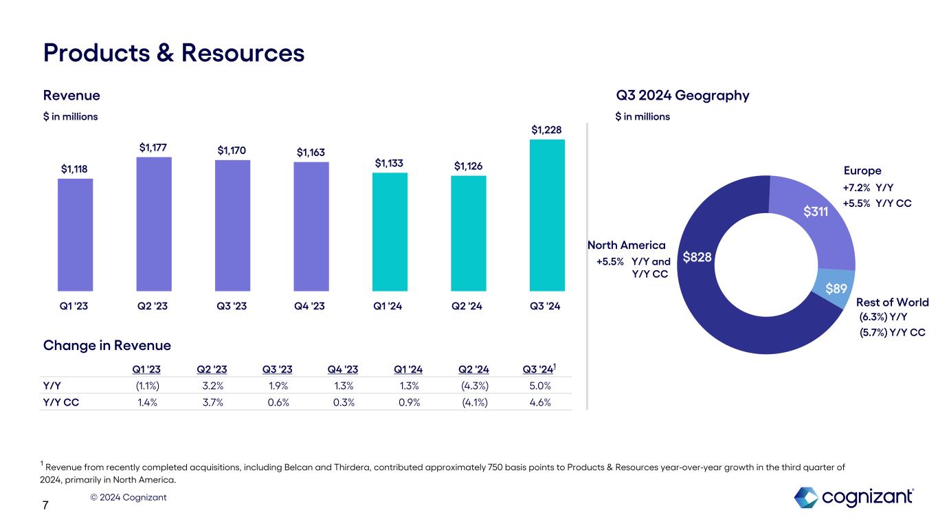 © 2024 Cognizant 6 $1,295 $190 $29 Health Sciences North America Europe Rest of World —% Y/Y +1.7% Y/Y CC +4.4% Y/Y +3.0% Y/Y CC +8.5% Y/Y and Y/Y CC Revenue $ in millions Q1 '23 Q2 '23 Q3'23 Q4 '23 Q1 '24 Q2 '24 Q3 '24 Y/Y 2.9% 2.3% —% (2.1%) (1.2%) 1.5% 7.8% Y/Y CC 3.5% 2.1% (0.8%) (2.7%) (1.3%) 1.7% 7.6% $1,433 $1,440 $1,405 $1,396 $1,416 $1,461 $1,514 Q1 '23 Q2 '23 Q3 '23 Q4 '23 Q1 '24 Q2 '24 Q3 '24 Change in Revenue $ in millions Q3 2024 Geography