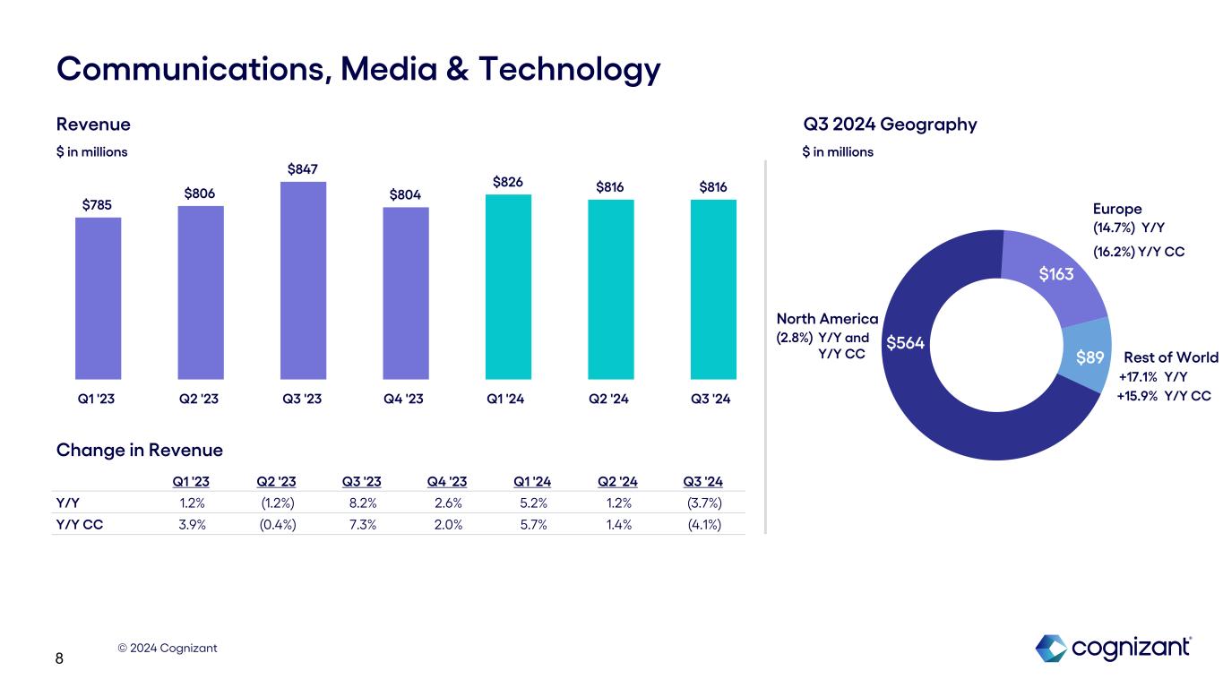 © 2024 Cognizant 7 $828 $311 $89 North America Europe Products & Resources +5.5% Y/Y and Y/Y CC +7.2% Y/Y +5.5% Y/Y CC (6.3%) Y/Y (5.7%) Y/Y CC Rest of World Revenue $ in millions Q1 '23 Q2 '23 Q3 '23 Q4 '23 Q1 '24 Q2 '24 Q3 '241 Y/Y (1.1%) 3.2% 1.9% 1.3% 1.3% (4.3%) 5.0% Y/Y CC 1.4% 3.7% 0.6% 0.3% 0.9% (4.1%) 4.6% $1,118 $1,177 $1,170 $1,163 $1,133 $1,126 $1,228 Q1 '23 Q2 '23 Q3 '23 Q4 '23 Q1 '24 Q2 '24 Q3 '24 Change in Revenue $ in millions Q3 2024 Geography 1 Revenue from recently completed acquisitions, including Belcan and Thirdera, contributed approximately 750 basis points to Products & Resources year-over-year growth in the third quarter of 2024, primarily in North America.