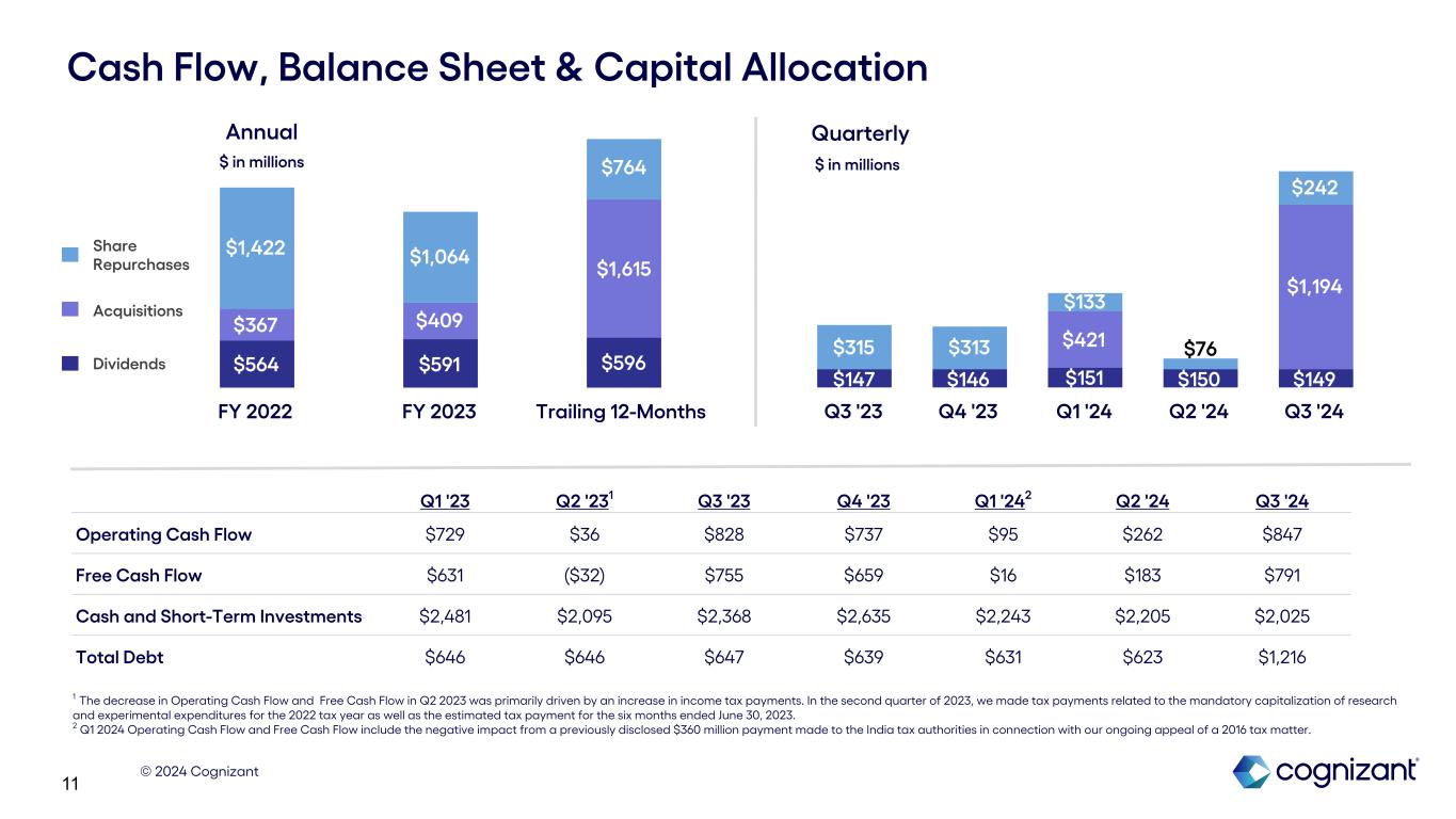 © 2024 Cognizant 11 $564 $591 $596 $367 $409 $1,615 $1,422 $1,064 $764 FY 2022 FY 2023 Trailing 12-Months Acquisitions Share Repurchases $147 $146 $151 $150 $149 $421 $1,194 $315 $313 $133 $76 $242 Q3 '23 Q4 '23 Q1 '24 Q2 '24 Q3 '24 Cash Flow, Balance Sheet & Capital Allocation Q1 '23 Q2 '231 Q3 '23 Q4 '23 Q1 '242 Q2 '24 Q3 '24 Operating Cash Flow $729 $36 $828 $737 $95 $262 $847 Free Cash Flow $631 ($32) $755 $659 $16 $183 $791 Cash and Short-Term Investments $2,481 $2,095 $2,368 $2,635 $2,243 $2,205 $2,025 Total Debt $646 $646 $647 $639 $631 $623 $1,216 Annual Quarterly Dividends $ in millions $ in millions 1 The decrease in Operating Cash Flow and Free Cash Flow in Q2 2023 was primarily driven by an increase in income tax payments. In the second quarter of 2023, we made tax payments related to the mandatory capitalization of research and experimental expenditures for the 2022 tax year as well as the estimated tax payment for the six months ended June 30, 2023. 2 Q1 2024 Operating Cash Flow and Free Cash Flow include the negative impact from a previously disclosed $360 million payment made to the India tax authorities in connection with our ongoing appeal of a 2016 tax matter.