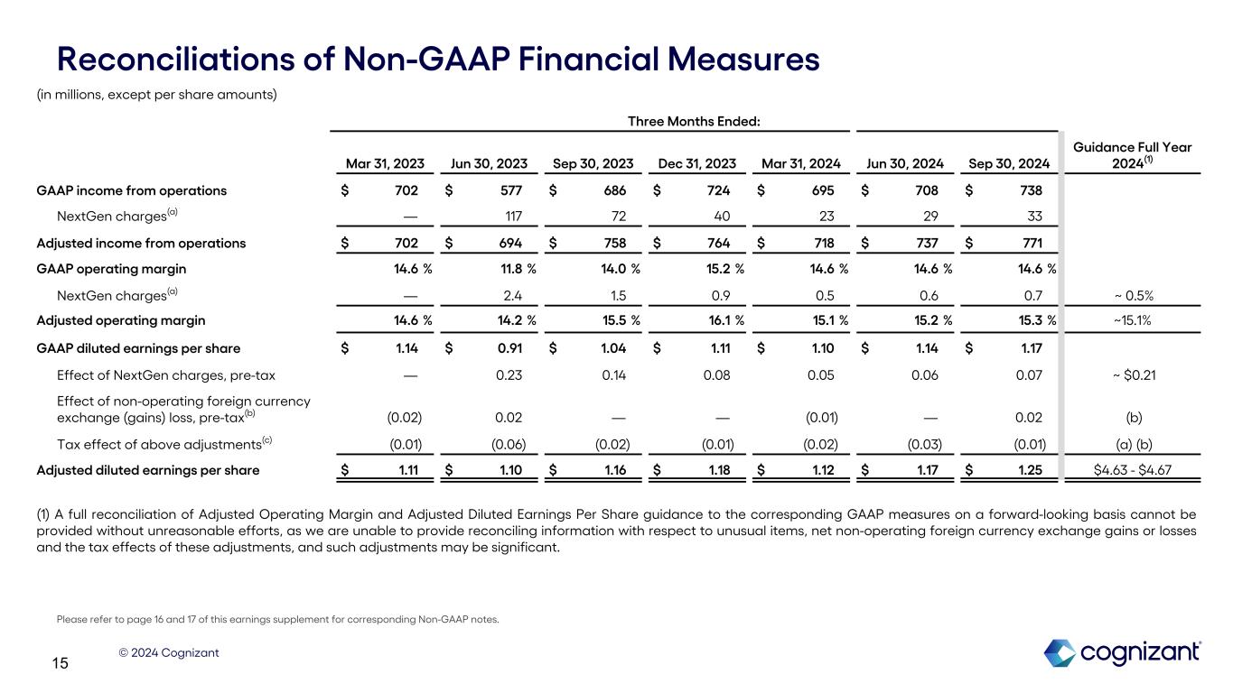 © 2024 Cognizant 14 Non-GAAP Financial Measures To supplement our financial results presented in accordance with GAAP, this earnings supplement includes references to the following measures defined by the Securities and Exchange Commission as non-GAAP financial measures: Adjusted Operating Margin, Adjusted Diluted EPS, free cash flow, constant currency revenue growth, Adjusted effective tax rate and net interest income. These non-GAAP financial measures are not based on any comprehensive set of accounting rules or principles and should not be considered a substitute for, or superior to, financial measures calculated in accordance with GAAP, and may be different from non-GAAP financial measures used by other companies. In addition, these non-GAAP financial measures should be read in conjunction with our financial statements prepared in accordance with GAAP. The reconciliations of our non-GAAP financial measures to the corresponding GAAP measures should be carefully evaluated. Our non-GAAP financial measures Adjusted Operating Margin and Adjusted Income from Operations excludes unusual items, such as NextGen charges. Our non-GAAP financial measure Adjusted Diluted EPS excludes unusual items, such as NextGen charges, and net non-operating foreign currency exchange gains or losses and the tax impact of all the applicable adjustments. The income tax impact of each item excluded from Adjusted Diluted EPS is calculated by applying the statutory rate and local tax regulations in the jurisdiction in which the item was incurred. Free cash flow is defined as cash flows from operating activities net of purchases of property and equipment. Constant currency revenue growth is defined as revenues for a given period restated at the comparative period’s foreign currency exchange rates measured against the comparative period's reported revenues. Adjusted effective tax rate reflects a tax rate commensurate with our non-GAAP Adjusted EPS. Net Interest Income is defined as interest income less interest expense. Management believes providing investors with an operating view consistent with how we manage the Company provides enhanced transparency into our operating results. For our internal management reporting and budgeting purposes, we use various GAAP and non-GAAP financial measures for financial and operational decision-making, to evaluate period-to-period comparisons, to determine portions of the compensation for our executive officers and for making comparisons of our operating results to those of our competitors. Accordingly, we believe that the presentation of our non-GAAP measures, which exclude certain costs, when read in conjunction with our reported GAAP results, can provide useful supplemental information to our management and investors regarding financial and business trends relating to our financial condition and results of operations. A limitation of using non-GAAP financial measures versus financial measures calculated in accordance with GAAP is that non-GAAP financial measures do not reflect all of the amounts associated with our operating results as determined in accordance with GAAP and may exclude costs that are recurring such as our net non-operating foreign currency exchange gains or losses. In addition, other companies may calculate non-GAAP financial measures differently than us, thereby limiting the usefulness of these non-GAAP financial measures as a comparative tool. We compensate for these limitations by providing specific information regarding the GAAP amounts excluded from our non-GAAP financial measures to allow investors to evaluate such non-GAAP financial measures. Performance Metrics Bookings are defined as total contract value (or TCV) of new contracts, including new contract sales as well as renewals and expansions of existing contracts. Bookings can vary significantly quarter to quarter depending in part on the timing of the signing of a small number of large contracts. Our book-to-bill ratio is defined as bookings for the trailing twelve months divided by revenue for the same period. Measuring bookings involves the use of estimates and judgments and there are no independent standards or requirements governing the calculation of bookings. The extent and timing of conversion of bookings to revenues may be impacted by, among other factors, the types of services and solutions sold, contract duration, the pace of client spending, actual volumes of services delivered as compared to the volumes anticipated at the time of sale, and contract modifications, including terminations, over the lifetime of a contract. The majority of our contracts are terminable by the client on short notice often without penalty, and some without notice. We do not update our bookings for subsequent terminations, reductions or foreign currency exchange rate fluctuations. Information regarding our bookings is not comparable to, nor should it be substituted for, an analysis of our reported revenues. However, management believes that it is a key indicator of potential future revenues and provides a useful indicator of the volume of our business over time. About Non-GAAP Financial Measures and Performance Metrics