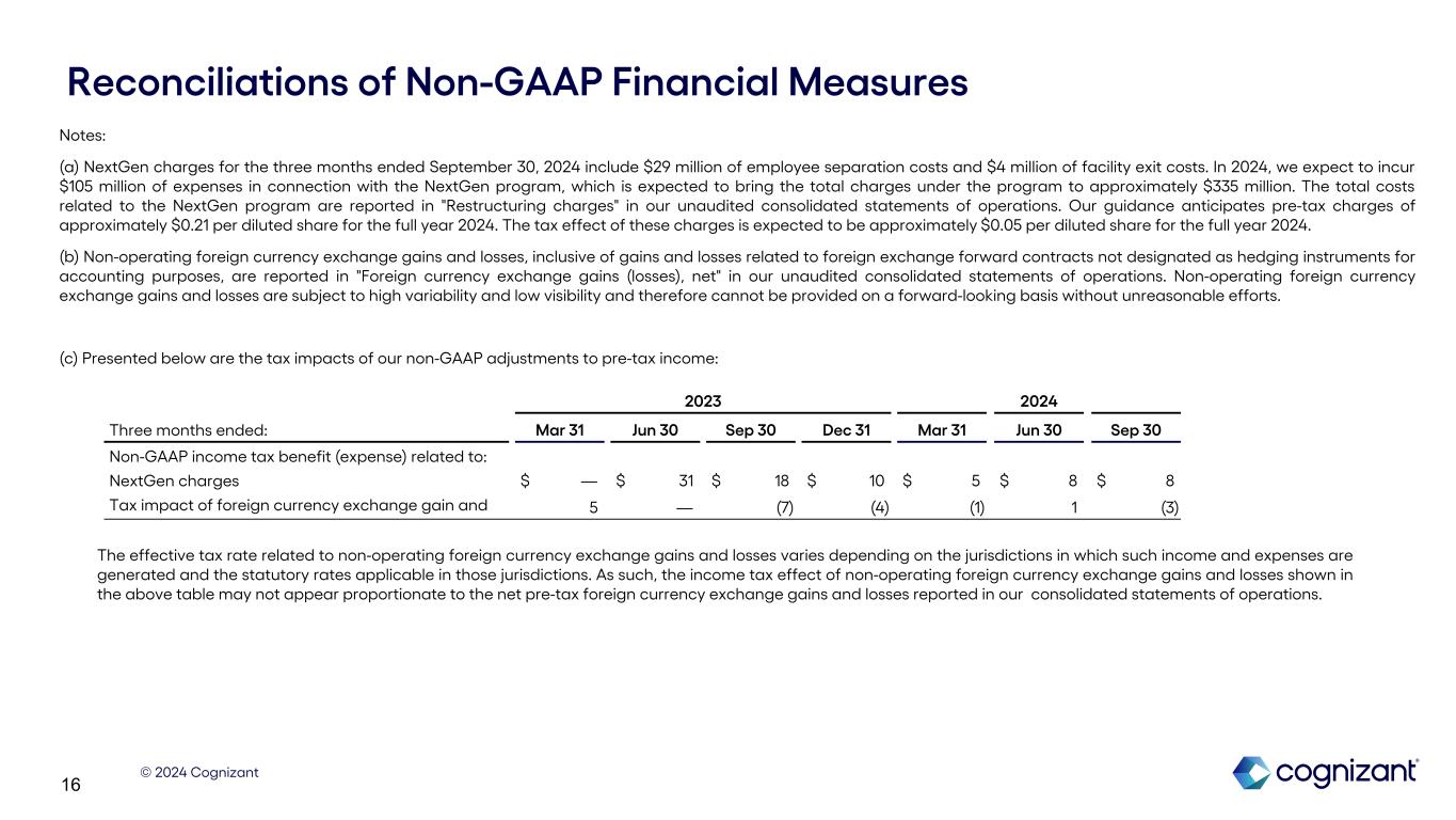 © 2024 Cognizant 15 Reconciliations of Non-GAAP Financial Measures Please refer to page 16 and 17 of this earnings supplement for corresponding Non-GAAP notes. (in millions, except per share amounts) Three Months Ended: Mar 31, 2023 Jun 30, 2023 Sep 30, 2023 Dec 31, 2023 Mar 31, 2024 Jun 30, 2024 Sep 30, 2024 Guidance Full Year 2024(1) GAAP income from operations $ 702 $ 577 $ 686 $ 724 $ 695 $ 708 $ 738 NextGen charges(a) — 117 72 40 23 29 33 Adjusted income from operations $ 702 $ 694 $ 758 $ 764 $ 718 $ 737 $ 771 GAAP operating margin 14.6 % 11.8 % 14.0 % 15.2 % 14.6 % 14.6 % 14.6 % NextGen charges(a) — 2.4 1.5 0.9 0.5 0.6 0.7 ~ 0.5% Adjusted operating margin 14.6 % 14.2 % 15.5 % 16.1 % 15.1 % 15.2 % 15.3 % ~15.1% GAAP diluted earnings per share $ 1.14 $ 0.91 $ 1.04 $ 1.11 $ 1.10 $ 1.14 $ 1.17 Effect of NextGen charges, pre-tax — 0.23 0.14 0.08 0.05 0.06 0.07 ~ $0.21 Effect of non-operating foreign currency exchange (gains) loss, pre-tax(b) (0.02) 0.02 — — (0.01) — 0.02 (b) Tax effect of above adjustments(c) (0.01) (0.06) (0.02) (0.01) (0.02) (0.03) (0.01) (a) (b) Adjusted diluted earnings per share $ 1.11 $ 1.10 $ 1.16 $ 1.18 $ 1.12 $ 1.17 $ 1.25 $4.63 - $4.67 (1) A full reconciliation of Adjusted Operating Margin and Adjusted Diluted Earnings Per Share guidance to the corresponding GAAP measures on a forward-looking basis cannot be provided without unreasonable efforts, as we are unable to provide reconciling information with respect to unusual items, net non-operating foreign currency exchange gains or losses and the tax effects of these adjustments, and such adjustments may be significant.