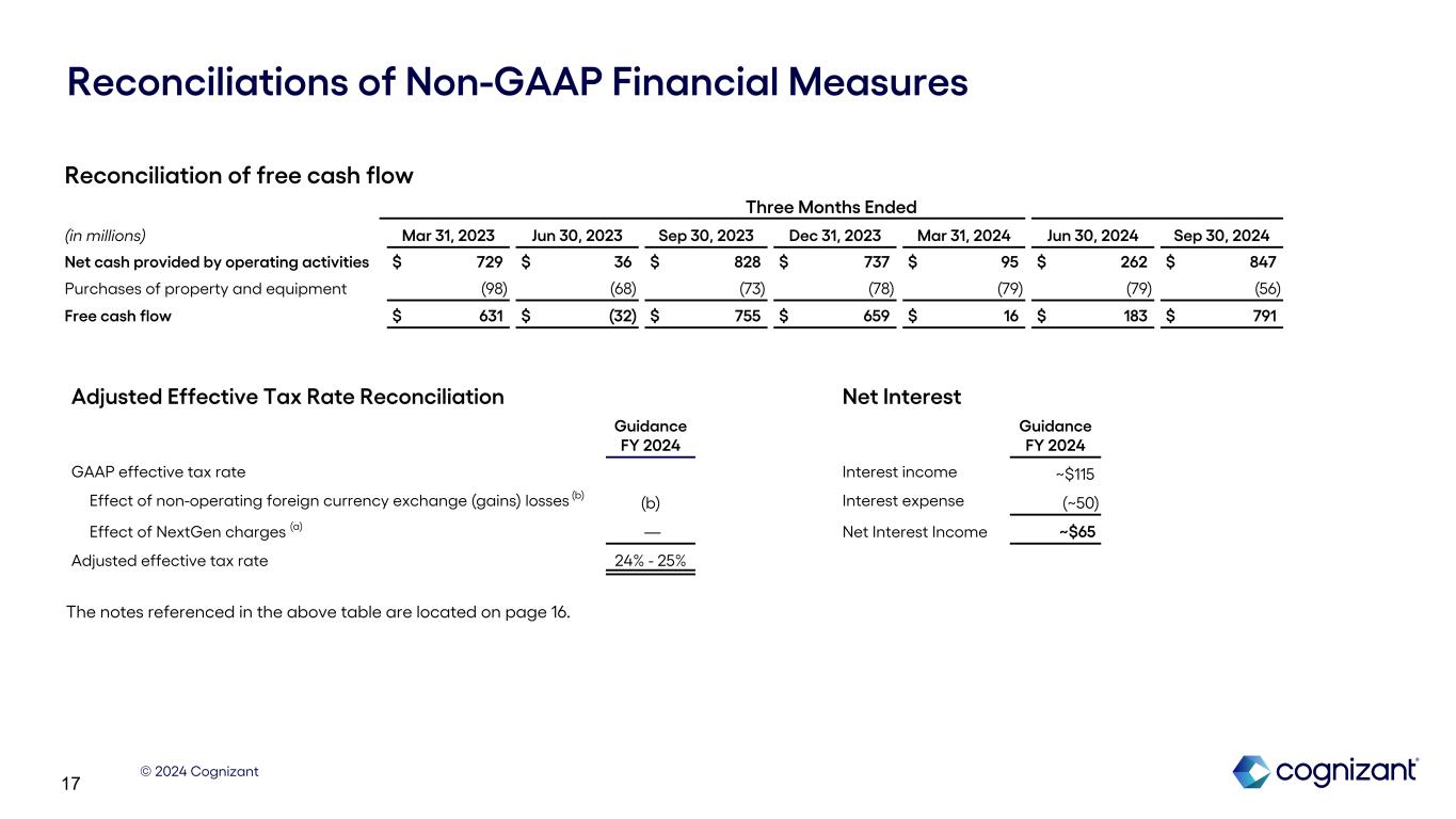 © 2024 Cognizant 16 Reconciliations of Non-GAAP Financial Measures Notes: (a) NextGen charges for the three months ended September 30, 2024 include $29 million of employee separation costs and $4 million of facility exit costs. In 2024, we expect to incur $105  million of expenses in connection with the NextGen program, which is expected to bring the total charges under the program to approximately $335  million. The total costs related to the NextGen program are reported in "Restructuring charges" in our unaudited consolidated statements of operations. Our guidance anticipates pre-tax charges of approximately $0.21 per diluted share for the full year 2024. The tax effect of these charges is expected to be approximately $0.05 per diluted share for the full year 2024. (b) Non-operating foreign currency exchange gains and losses, inclusive of gains and losses related to foreign exchange forward contracts not designated as hedging instruments for accounting purposes, are reported in "Foreign currency exchange gains (losses), net" in our unaudited consolidated statements of operations. Non-operating foreign currency exchange gains and losses are subject to high variability and low visibility and therefore cannot be provided on a forward-looking basis without unreasonable efforts. 2023 2024 Three months ended: Mar 31 Jun 30 Sep 30 Dec 31 Mar 31 Jun 30 Sep 30 Non-GAAP income tax benefit (expense) related to: NextGen charges $ — $ 31 $ 18 $ 10 $ 5 $ 8 $ 8 Tax impact of foreign currency exchange gain and losses 5 — (7) (4) (1) 1 (3) (c) Presented below are the tax impacts of our non-GAAP adjustments to pre-tax income: The effective tax rate related to non-operating foreign currency exchange gains and losses varies depending on the jurisdictions in which such income and expenses are generated and the statutory rates applicable in those jurisdictions. As such, the income tax effect of non-operating foreign currency exchange gains and losses shown in the above table may not appear proportionate to the net pre-tax foreign currency exchange gains and losses reported in our consolidated statements of operations.