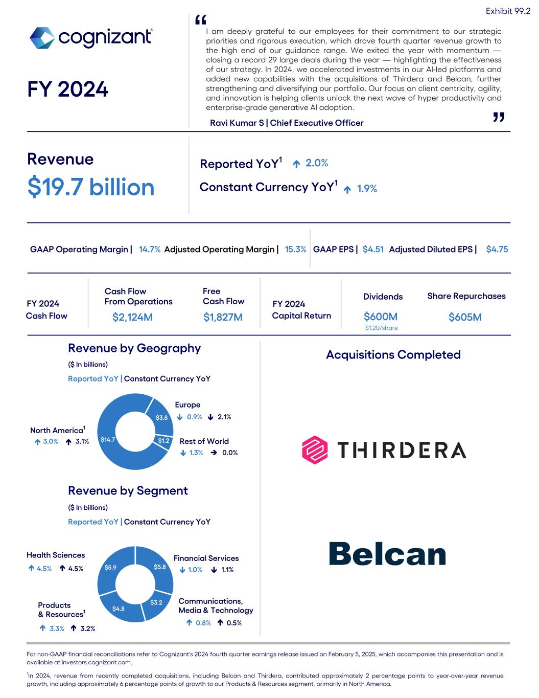 I am deeply grateful to our employees for their commitment to our strategic priorities and rigorous execution, which drove fourth quarter revenue growth to the high end of our guidance range. We exited the year with momentum — closing a record 29 large deals during the year — highlighting the effectiveness of our strategy. In 2024, we accelerated investments in our AI-led platforms and added new capabilities with the acquisitions of Thirdera and Belcan, further strengthening and diversifying our portfolio. Our focus on client centricity, agility, and innovation is helping clients unlock the next wave of hyper productivity and enterprise-grade generative AI adoption. FY 2024 Ravi Kumar S | Chief Executive Officer ” Revenue $19.7 billion Reported YoY1 é 2.0% Constant Currency YoY1 é 1.9% GAAP Operating Margin | 14.7% GAAP EPS | $4.51 $14.7 $3.8 $1.2 Rest of World 1.3% Revenue by Geography ($ In billions) Reported YoY | Constant Currency YoY Cash Flow Cash Flow From Operations $2,124M Free Cash Flow $1,827M Capital Return Dividends $600M Share Repurchases $605M $1.20/share Revenue by Segment ($ In billions) Reported YoY | Constant Currency YoY Europe North America1 0.0% $5.8 $3.2 $4.8 $5.9 Products & Resources1 Health Sciences Financial Services Communications, Media & Technology 0.9% 2.1% 3.0% 3.1% 0.8% 0.5% 3.3% 3.2% 1.0% 1.1% 4.5% 4.5% ” For non-GAAP financial reconciliations refer to Cognizant's 2024 fourth quarter earnings release issued on February 5, 2025, which accompanies this presentation and is available at investors.cognizant.com. 1In 2024, revenue from recently completed acquisitions, including Belcan and Thirdera, contributed approximately 2 percentage points to year-over-year revenue growth, including approximately 6 percentage points of growth to our Products & Resources segment, primarily in North America. é é é é é é é é é é é éé é Adjusted Diluted EPS | $4.75 Acquisitions Completed Adjusted Operating Margin | 15.3% Exhibit 99.2 FY 2024 FY 2024