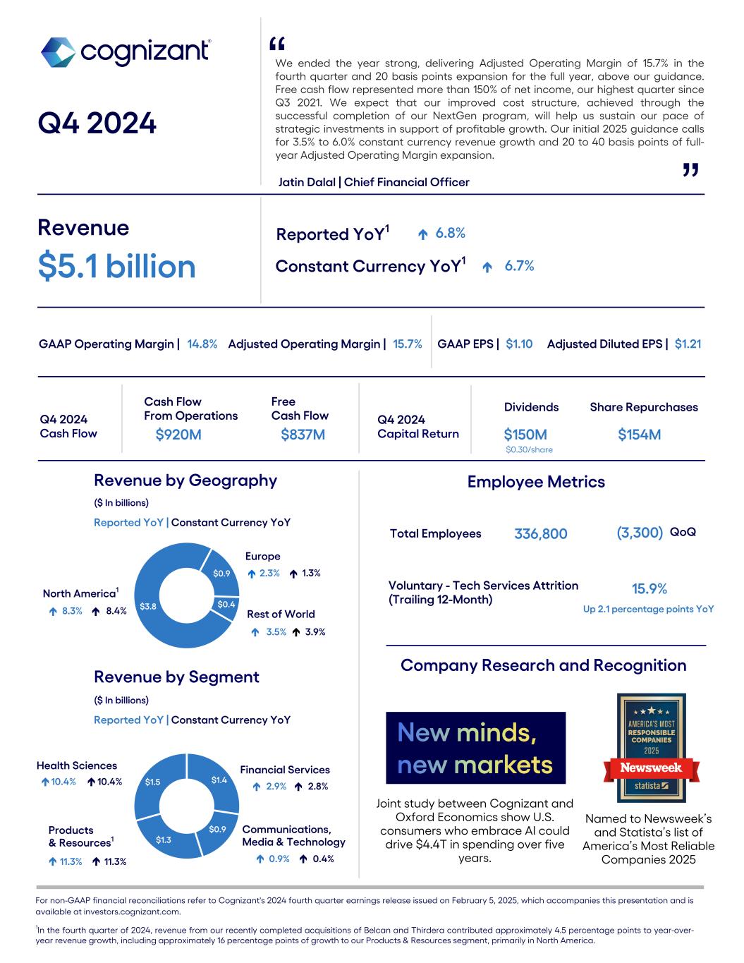 We ended the year strong, delivering Adjusted Operating Margin of 15.7% in the fourth quarter and 20 basis points expansion for the full year, above our guidance. Free cash flow represented more than 150% of net income, our highest quarter since Q3 2021. We expect that our improved cost structure, achieved through the successful completion of our NextGen program, will help us sustain our pace of strategic investments in support of profitable growth. Our initial 2025 guidance calls for 3.5% to 6.0% constant currency revenue growth and 20 to 40 basis points of full- year Adjusted Operating Margin expansion. Q4 2024 Jatin Dalal | Chief Financial Officer ” Revenue $5.1 billion Reported YoY1 é 6.8% Constant Currency YoY1 é 6.7% GAAP Operating Margin | 14.8% GAAP EPS | $1.10 $3.8 $0.9 $0.4 Rest of World 3.5% Revenue by Geography ($ In billions) Reported YoY | Constant Currency YoY Q4 2024 Cash Flow Cash Flow From Operations $920M Free Cash Flow $837M Q4 2024 Capital Return Dividends $150M Share Repurchases $154M $0.30/share Revenue by Segment ($ In billions) Reported YoY | Constant Currency YoY Europe North America1 3.9% $1.4 $0.9 $1.3 $1.5 Products & Resources1 Health Sciences Financial Services Communications, Media & Technology 2.3% 1.3% 8.3% 8.4% 0.9% 0.4%11.3% 11.3% 2.9% 2.8%10.4% 10.4% Total Employees 336,800 ” (3,300) QoQ Voluntary - Tech Services Attrition (Trailing 12-Month) 15.9% é é é é é é é é é é é Adjusted Diluted EPS | $1.21 Employee Metrics Up 2.1 percentage points YoY Adjusted Operating Margin | 15.7% é é é For non-GAAP financial reconciliations refer to Cognizant's 2024 fourth quarter earnings release issued on February 5, 2025, which accompanies this presentation and is available at investors.cognizant.com. 1In the fourth quarter of 2024, revenue from our recently completed acquisitions of Belcan and Thirdera contributed approximately 4.5 percentage points to year-over- year revenue growth, including approximately 16 percentage points of growth to our Products & Resources segment, primarily in North America. é Company Research and Recognition Joint study between Cognizant and Oxford Economics show U.S. consumers who embrace AI could drive $4.4T in spending over five years. Named to Newsweek’s and Statista’s list of America’s Most Reliable Companies 2025