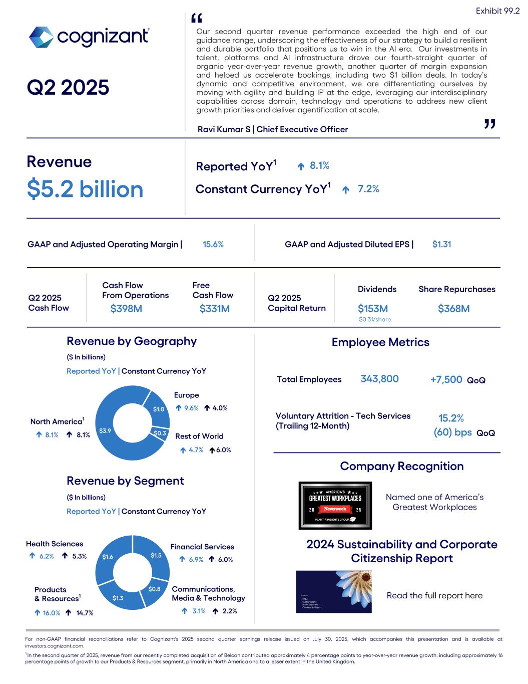 Our second quarter revenue performance exceeded the high end of our guidance range, underscoring the effectiveness of our strategy to build a resilient and durable portfolio that positions us to win in the AI era. Our investments in talent, platforms and AI infrastructure drove our fourth-straight quarter of organic year-over-year revenue growth, another quarter of margin expansion and helped us accelerate bookings, including two $1 billion deals. In today’s dynamic and competitive environment, we are differentiating ourselves by moving with agility and building IP at the edge, leveraging our interdisciplinary capabilities across domain, technology and operations to address new client growth priorities and deliver agentification at scale. Q2 2025 Ravi Kumar S | Chief Executive Officer ” Revenue $5.2 billion Reported YoY1 é 8.1% Constant Currency YoY1 é 7.2% GAAP and Adjusted Operating Margin | 15.6% GAAP and Adjusted Diluted EPS | $1.31 $3.9 $1.0 $0.3 Rest of World 4.7% Revenue by Geography ($ In billions) Reported YoY | Constant Currency YoY Q2 2025 Cash Flow Cash Flow From Operations $398M Free Cash Flow $331M Q2 2025 Capital Return Dividends $153M Share Repurchases $368M $0.31/share Revenue by Segment ($ In billions) Reported YoY | Constant Currency YoY Europe North America1 6.0% $1.5 $0.8 $1.3 $1.6 Products & Resources1 Health Sciences Financial Services Communications, Media & Technology 9.6% 4.0% 8.1% 8.1% 3.1% 2.2%16.0% 14.7% 6.9% 6.0%6.2% 5.3% Total Employees 343,800 ” +7,500 QoQ Voluntary Attrition - Tech Services (Trailing 12-Month) 15.2% é é é é é é é é é é é Adjusted Diluted EPS | $1.31 Employee Metrics Adjusted Operating Margin | 15.6% é é é For non-GAAP financial reconciliations refer to Cognizant's 2025 second quarter earnings release issued on July  30, 2025, which accompanies this presentation and is available at investors.cognizant.com. 1 In the second quarter of 2025, revenue from our recently completed acquisition of Belcan contributed approximately 4 percentage points to year-over-year revenue growth, including approximately 16 percentage points of growth to our Products & Resources segment, primarily in North America and to a lesser extent in the United Kingdom. é Company Recognition Named one of America’s Greatest Workplaces Exhibit 99.2 (60) bps QoQ 2024 Sustainability and Corporate Citizenship Report Read the full report here