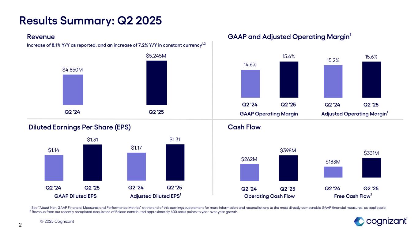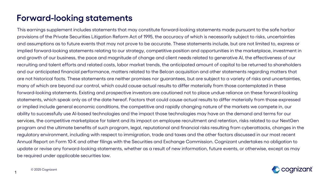 © 2025 Cognizant 1 Forward-looking statements This earnings supplement includes statements that may constitute forward-looking statements made pursuant to the safe harbor provisions of the Private Securities Litigation Reform Act of 1995, the accuracy of which is necessarily subject to risks, uncertainties and assumptions as to future events that may not prove to be accurate. These statements include, but are not limited to, express or implied forward-looking statements relating to our strategy, competitive position and opportunities in the marketplace, investment in and growth of our business, the pace and magnitude of change and client needs related to generative AI, the effectiveness of our recruiting and talent efforts and related costs, labor market trends, the anticipated amount of capital to be returned to shareholders and our anticipated financial performance, matters related to the Belcan acquisition and other statements regarding matters that are not historical facts. These statements are neither promises nor guarantees, but are subject to a variety of risks and uncertainties, many of which are beyond our control, which could cause actual results to differ materially from those contemplated in these forward-looking statements. Existing and prospective investors are cautioned not to place undue reliance on these forward-looking statements, which speak only as of the date hereof. Factors that could cause actual results to differ materially from those expressed or implied include general economic conditions, the competitive and rapidly changing nature of the markets we compete in, our ability to successfully use AI-based technologies and the impact those technologies may have on the demand and terms for our services, the competitive marketplace for talent and its impact on employee recruitment and retention, risks related to our NextGen program and the ultimate benefits of such program, legal, reputational and financial risks resulting from cyberattacks, changes in the regulatory environment, including with respect to immigration, trade and taxes and the other factors discussed in our most recent Annual Report on Form 10-K and other filings with the Securities and Exchange Commission. Cognizant undertakes no obligation to update or revise any forward-looking statements, whether as a result of new information, future events, or otherwise, except as may be required under applicable securities law.