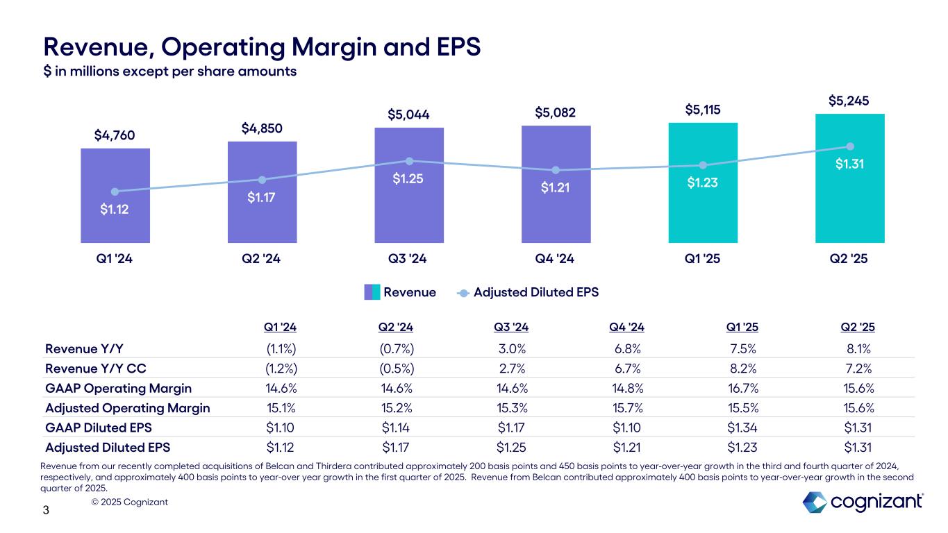© 2025 Cognizant 2 $262M $398M Q2 '24 Q2 '25 Results Summary: Q2 2025 1 See “About Non-GAAP Financial Measures and Performance Metrics” at the end of this earnings supplement for more information and reconciliations to the most directly comparable GAAP financial measures, as applicable. 2 Revenue from our recently completed acquisition of Belcan contributed approximately 400 basis points to year-over-year growth. Revenue Increase of 8.1% Y/Y as reported, and an increase of 7.2% Y/Y in constant currency1,2 GAAP and Adjusted Operating Margin1 Cash Flow $4,850M $5,245M Q2 '24 Q2 '25 14.6% 15.6% Q2 '24 Q2 '25 15.2% 15.6% Q2 '24 Q2 '25 $183M $331M Q2 '24 Q2 '25 $1.14 $1.31 Q2 '24 Q2 '25 $1.17 $1.31 Q2 '24 Q2 '25 Adjusted Operating Margin1 GAAP Diluted EPS Adjusted Diluted EPS1 Operating Cash Flow Free Cash Flow1 GAAP Operating Margin Adjusted Operating Margin1 Diluted Earnings Per Share (EPS)