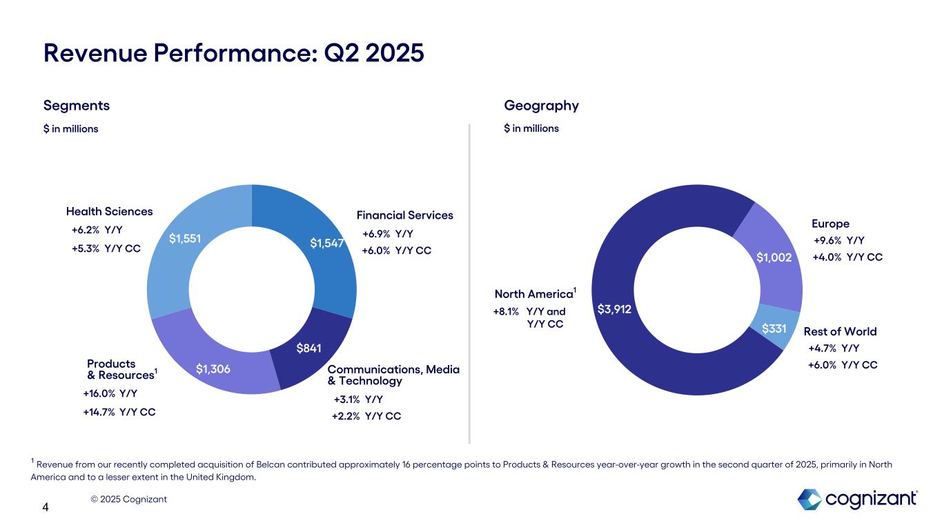 © 2025 Cognizant 3 $4,760 $4,850 $5,044 $5,082 $5,115 $5,245 $1.12 $1.17 $1.25 $1.21 $1.23 $1.31 Revenue Adjusted Diluted EPS Q1 '24 Q2 '24 Q3 '24 Q4 '24 Q1 '25 Q2 '25 $ in millions except per share amounts Q1 '24 Q2 '24 Q3 '24 Q4 '24 Q1 '25 Q2 '25 Revenue Y/Y (1.1%) (0.7%) 3.0% 6.8% 7.5% 8.1% Revenue Y/Y CC (1.2%) (0.5%) 2.7% 6.7% 8.2% 7.2% GAAP Operating Margin 14.6% 14.6% 14.6% 14.8% 16.7% 15.6% Adjusted Operating Margin 15.1% 15.2% 15.3% 15.7% 15.5% 15.6% GAAP Diluted EPS $1.10 $1.14 $1.17 $1.10 $1.34 $1.31 Adjusted Diluted EPS $1.12 $1.17 $1.25 $1.21 $1.23 $1.31 Revenue, Operating Margin and EPS 1 Revenue from our recently completed acquisitions of Belcan and Thirdera contributed approximately 200 basis points and 450 basis points to year-over-year growth in the third and fourth quarter of 2024, respectively, and approximately 400 basis points to year-over year growth in the first quarter of 2025. Revenue from Belcan contributed approximately 400 basis points to year-over-year growth in the second quarter of 2025.