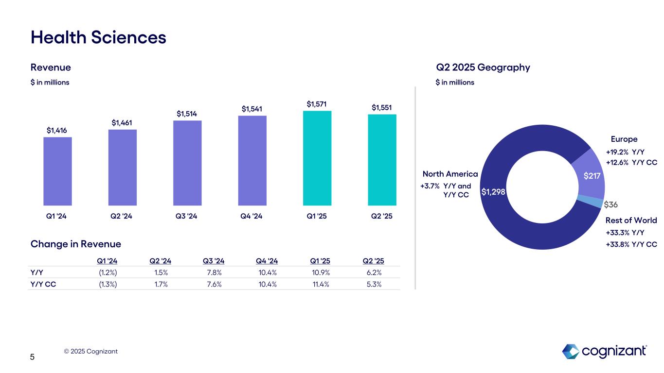 © 2025 Cognizant 4 $3,912 $1,002 $331 $1,547 $841 $1,306 $1,551 Revenue Performance: Q2 2025 Products & Resources1 Communications, Media & Technology Health Sciences Financial Services North America1 Europe Rest of World Segments $ in millions Geography $ in millions +3.1% Y/Y +2.2% Y/Y CC +16.0% Y/Y +14.7% Y/Y CC +6.2% Y/Y +5.3% Y/Y CC +6.9% Y/Y +6.0% Y/Y CC +9.6% Y/Y +4.0% Y/Y CC +4.7% Y/Y +6.0% Y/Y CC +8.1% Y/Y and Y/Y CC 1 Revenue from our recently completed acquisition of Belcan contributed approximately 16 percentage points to Products & Resources year-over-year growth in the second quarter of 2025, primarily in North America and to a lesser extent in the United Kingdom.
