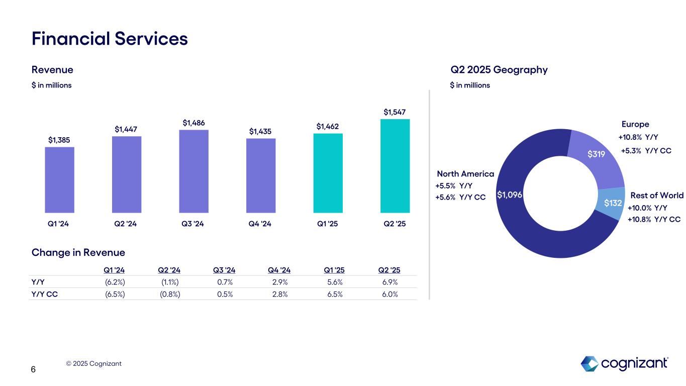 © 2025 Cognizant 5 $1,298 $217 $36 Health Sciences North America Europe Rest of World +33.3% Y/Y +33.8% Y/Y CC +19.2% Y/Y +12.6% Y/Y CC +3.7% Y/Y and Y/Y CC Revenue $ in millions Q1 '24 Q2 '24 Q3 '24 Q4 '24 Q1 '25 Q2 '25 Y/Y (1.2%) 1.5% 7.8% 10.4% 10.9% 6.2% Y/Y CC (1.3%) 1.7% 7.6% 10.4% 11.4% 5.3% $1,416 $1,461 $1,514 $1,541 $1,571 $1,551 Q1 '24 Q2 '24 Q3 '24 Q4 '24 Q1 '25 Q2 '25 Change in Revenue $ in millions Q2 2025 Geography