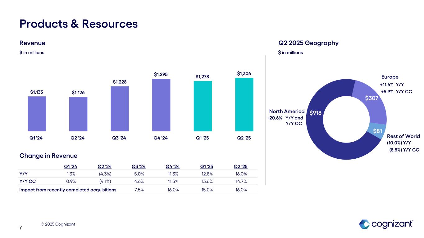 © 2025 Cognizant 6 $1,096 $319 $132 Financial Services North America Europe Rest of World Q1 '24 Q2 '24 Q3 '24 Q4 '24 Q1 '25 Q2 '25 Y/Y (6.2%) (1.1%) 0.7% 2.9% 5.6% 6.9% Y/Y CC (6.5%) (0.8%) 0.5% 2.8% 6.5% 6.0% +10.0% Y/Y +10.8% Y/Y CC +10.8% Y/Y +5.3% Y/Y CC Revenue Change in Revenue $ in millions $ in millions Q2 2025 Geography +5.5% Y/Y +5.6% Y/Y CC $1,385 $1,447 $1,486 $1,435 $1,462 $1,547 Q1 '24 Q2 '24 Q3 '24 Q4 '24 Q1 '25 Q2 '25