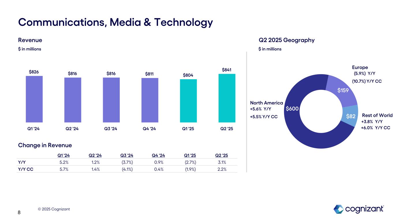 © 2025 Cognizant 7 $918 $307 $81 North America Europe Products & Resources +20.6% Y/Y and Y/Y CC +11.6% Y/Y +5.9% Y/Y CC (10.0%) Y/Y (8.8%) Y/Y CC Rest of World Revenue $ in millions Q1 '24 Q2 '24 Q3 '24 Q4 '24 Q1 '25 Q2 '25 Y/Y 1.3% (4.3%) 5.0% 11.3% 12.8% 16.0% Y/Y CC 0.9% (4.1%) 4.6% 11.3% 13.6% 14.7% Impact from recently completed acquisitions 7.5% 16.0% 15.0% 16.0% $1,133 $1,126 $1,228 $1,295 $1,278 $1,306 Q1 '24 Q2 '24 Q3 '24 Q4 '24 Q1 '25 Q2 '25 Change in Revenue $ in millions Q2 2025 Geography