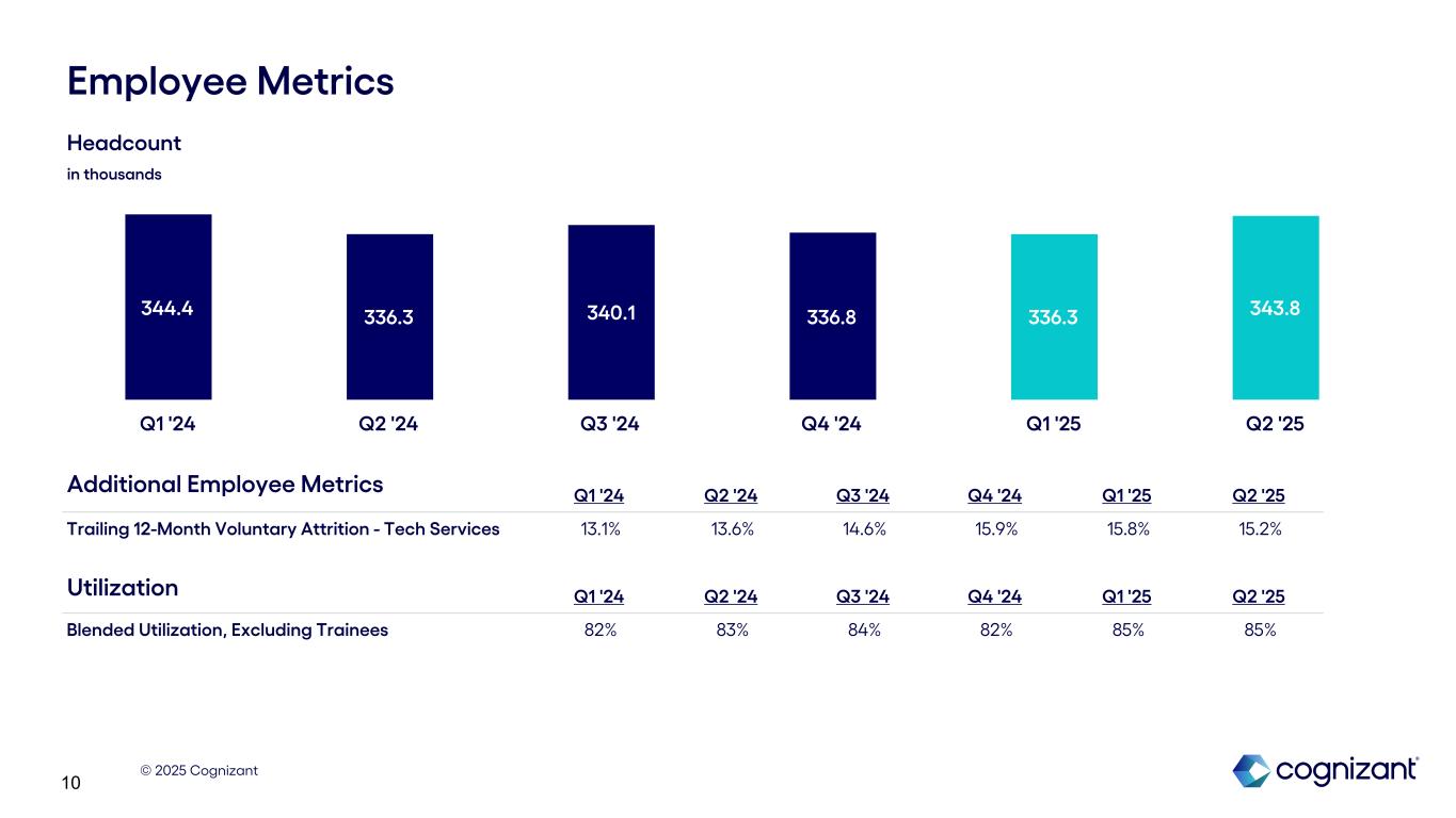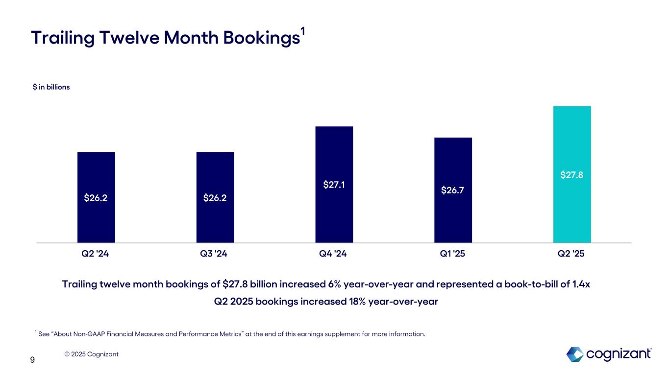 © 2025 Cognizant 9 $26.2 $26.2 $27.1 $26.7 $27.8 Q2 '24 Q3 '24 Q4 '24 Q1 '25 Q2 '25 Trailing Twelve Month Bookings1 Trailing twelve month bookings of $27.8 billion increased 6% year-over-year and represented a book-to-bill of 1.4x Q2 2025 bookings increased 18% year-over-year $ in billions 1 See “About Non-GAAP Financial Measures and Performance Metrics” at the end of this earnings supplement for more information.