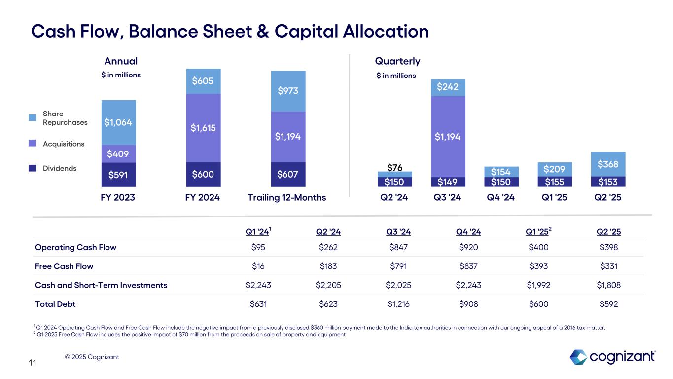 © 2025 Cognizant 17 Reconciliations of Non-GAAP Financial Measures Reconciliation of free cash flow Three Months Ended (in millions) Mar 31, 2024 Jun 30, 2024 Sep 30, 2024 Dec 31, 2024 Mar 31, 2025 Jun 30, 2025 Net cash provided by operating activities $ 95 $ 262 $ 847 $ 920 $ 400 $ 398 Purchases of property and equipment (79) (79) (56) (83) (77) (67) Proceeds from sale of property and equipment — — — — 70 — Free cash flow $ 16 $ 183 $ 791 $ 837 $ 393 $ 331 Adjusted Effective Tax Rate Reconciliation Guidance FY 2025 GAAP effective tax rate Effect of non-operating foreign currency exchange (gains) losses (c) (c) Effect of the gain on sale of property and equipment (a) — One-time income tax expense related to the enactment of the OBBBA(e) ~(12)% Adjusted effective tax rate 24% - 25% The notes referenced in the above table are located on page 16. Net Interest FY 2024 Guidance FY 2025 Interest income $53 ~$115 Interest expense (21) (~50) Net Interest Income $32 ~