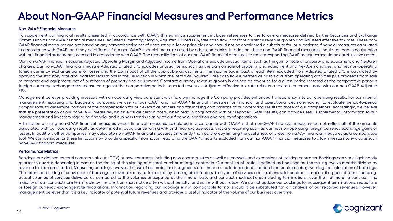 © 2025 Cognizant 14 Non-GAAP Financial Measures To supplement our financial results presented in accordance with GAAP, this earnings supplement includes references to the following measures defined by the Securities and Exchange Commission as non-GAAP financial measures: Adjusted Operating Margin, Adjusted Diluted EPS, free cash flow, constant currency revenue growth and Adjusted effective tax rate. These non- GAAP financial measures are not based on any comprehensive set of accounting rules or principles and should not be considered a substitute for, or superior to, financial measures calculated in accordance with GAAP, and may be different from non-GAAP financial measures used by other companies. In addition, these non-GAAP financial measures should be read in conjunction with our financial statements prepared in accordance with GAAP. The reconciliations of our non-GAAP financial measures to the corresponding GAAP measures should be carefully evaluated. Our non-GAAP financial measures Adjusted Operating Margin and Adjusted Income from Operations exclude unusual items, such as the gain on sale of property and equipment and NextGen charges. Our non-GAAP financial measure Adjusted Diluted EPS excludes unusual items, such as the gain on sale of property and equipment and NextGen charges, and net non-operating foreign currency exchange gains or losses and the tax impact of all the applicable adjustments. The income tax impact of each item excluded from Adjusted Diluted EPS is calculated by applying the statutory rate and local tax regulations in the jurisdiction in which the item was incurred. Free cash flow is defined as cash flows from operating activities plus proceeds from sale of property and equipment, net of purchases of property and equipment. Constant currency revenue growth is defined as revenues for a given period restated at the comparative period’s foreign currency exchange rates measured against the comparative period's reported revenues. Adjusted effective tax rate reflects a tax rate commensurate with our non-GAAP Adjusted EPS. Management believes providing investors with an operating view consistent with how we manage the Company provides enhanced transparency into our operating results. For our internal management reporting and budgeting purposes, we use various GAAP and non-GAAP financial measures for financial and operational decision-making, to evaluate period-to-period comparisons, to determine portions of the compensation for our executive officers and for making comparisons of our operating results to those of our competitors. Accordingly, we believe that the presentation of our non-GAAP measures, which exclude certain costs, when read in conjunction with our reported GAAP results, can provide useful supplemental information to our management and investors regarding financial and business trends relating to our financial condition and results of operations. A limitation of using non-GAAP financial measures versus financial measures calculated in accordance with GAAP is that non-GAAP financial measures do not reflect all of the amounts associated with our operating results as determined in accordance with GAAP and may exclude costs that are recurring such as our net non-operating foreign currency exchange gains or losses. In addition, other companies may calculate non-GAAP financial measures differently than us, thereby limiting the usefulness of these non-GAAP financial measures as a comparative tool. We compensate for these limitations by providing specific information regarding the GAAP amounts excluded from our non-GAAP financial measures to allow investors to evaluate such non-GAAP financial measures. Performance Metrics Bookings are defined as total contract value (or TCV) of new contracts, including new contract sales as well as renewals and expansions of existing contracts. Bookings can vary significantly quarter to quarter depending in part on the timing of the signing of a small number of large contracts. Our book-to-bill ratio is defined as bookings for the trailing twelve months divided by revenue for the same period. Measuring bookings involves the use of estimates and judgments and there are no independent standards or requirements governing the calculation of bookings. The extent and timing of conversion of bookings to revenues may be impacted by, among other factors, the types of services and solutions sold, contract duration, the pace of client spending, actual volumes of services delivered as compared to the volumes anticipated at the time of sale, and contract modifications, including terminations, over the lifetime of a contract. The majority of our contracts are terminable by the client on short notice often without penalty, and some without notice. We do not update our bookings for subsequent terminations, reductions or foreign currency exchange rate fluctuations. Information regarding our bookings is not comparable to, nor should it be substituted for, an analysis of our reported revenues. However, management believes that it is a key indicator of potential future revenues and provides a useful indicator of the volume of our business over time. About Non-GAAP Financial Measures and Performance Metrics