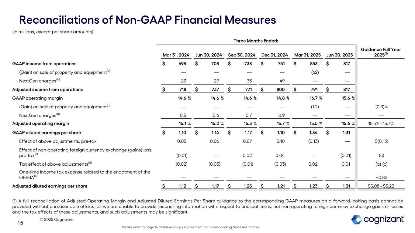 © 2025 Cognizant 15 Reconciliations of Non-GAAP Financial Measures Please refer to page 16 of this earnings supplement for corresponding Non-GAAP notes. (in millions, except per share amounts) Three Months Ended: Mar 31, 2024 Jun 30, 2024 Sep 30, 2024 Dec 31, 2024 Mar 31, 2025 Jun 30, 2025 Guidance Full Year 2025(1) GAAP income from operations $ 695 $ 708 $ 738 $ 751 $ 853 $ 817 (Gain) on sale of property and equipment(a) — — — — (62) — NextGen charges(b) 23 29 33 49 — — Adjusted income from operations $ 718 $ 737 $ 771 $ 800 $ 791 $ 817 GAAP operating margin 14.6 % 14.6 % 14.6 % 14.8 % 16.7 % 15.6 % (Gain) on sale of property and equipment(a) — — — — (1.2) — (0.3)% NextGen charges(b) 0.5 0.6 0.7 0.9 — — — Adjusted operating margin 15.1 % 15.2 % 15.3 % 15.7 % 15.5 % 15.6 % 15.5% - 15.7% GAAP diluted earnings per share $ 1.10 $ 1.14 $ 1.17 $ 1.10 $ 1.34 $ 1.31 Effect of above adjustments, pre-tax 0.05 0.06 0.07 0.10 (0.13) — $(0.13) Effect of non-operating foreign currency exchange (gains) loss, pre-tax(c) (0.01) — 0.02 0.04 — (0.01) (c) Tax effect of above adjustments(d) (0.02) (0.03) (0.01) (0.03) 0.02 0.01 (a) (c) One-time income tax expense related to the enactment of the OBBBA(e) — — — — — — ~0.82 Adjusted diluted earnings per share $ 1.12 $ 1.17 $ 1.25 $ 1.21 $ 1.23 $ 1.31 $5.08 - $5.22 (1) A full reconciliation of Adjusted Operating Margin and Adjusted Diluted Earnings Per Share guidance to the corresponding GAAP measures on a forward-looking basis cannot be provided without unreasonable efforts, as we are unable to provide reconciling information with respect to unusual items, net non-operating foreign currency exchange gains or losses and the tax effects of these adjustments, and such adjustments may be significant.