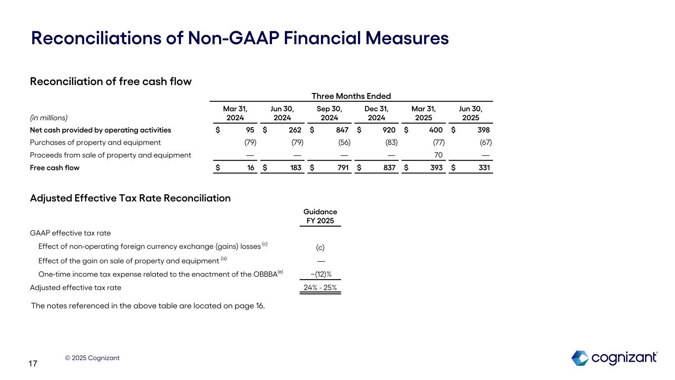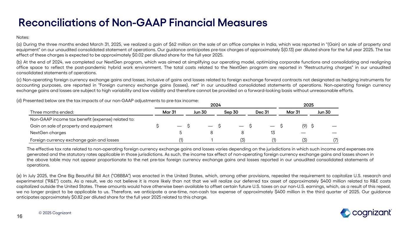 © 2025 Cognizant 16 Reconciliations of Non-GAAP Financial Measures Notes: (a) During the three months ended March 31, 2025, we realized a gain of $62 million on the sale of an office complex in India, which was reported in "(Gain) on sale of property and equipment" on our unaudited consolidated statement of operations. Our guidance anticipates pre-tax charges of approximately $(0.13) per diluted share for the full year 2025. The tax effect of these charges is expected to be approximately $0.02 per diluted share for the full year 2025. (b) At the end of 2024, we completed our NextGen program, which was aimed at simplifying our operating model, optimizing corporate functions and consolidating and realigning office space to reflect the post-pandemic hybrid work environment. The total costs related to the NextGen program are reported in "Restructuring charges" in our unaudited consolidated statements of operations. (c) Non-operating foreign currency exchange gains and losses, inclusive of gains and losses related to foreign exchange forward contracts not designated as hedging instruments for accounting purposes, are reported in "Foreign currency exchange gains (losses), net" in our unaudited consolidated statements of operations. Non-operating foreign currency exchange gains and losses are subject to high variability and low visibility and therefore cannot be provided on a forward-looking basis without unreasonable efforts. 2024 2025 Three months ended: Mar 31 Jun 30 Sep 30 Dec 31 Mar 31 Jun 30 Non-GAAP income tax benefit (expense) related to: Gain on sale of property and equipment $ — $ — $ — $ — $ (9) $ — NextGen charges 5 8 8 13 — — Foreign currency exchange gain and losses (1) 1 (3) (1) (3) (7) (d) Presented below are the tax impacts of our non-GAAP adjustments to pre-tax income: The effective tax rate related to non-operating foreign currency exchange gains and losses varies depending on the jurisdictions in which such income and expenses are generated and the statutory rates applicable in those jurisdictions. As such, the income tax effect of non-operating foreign currency exchange gains and losses shown in the above table may not appear proportionate to the net pre-tax foreign currency exchange gains and losses reported in our unaudited consolidated statements of operations. (e) In July 2025, the One Big Beautiful Bill Act ("OBBBA") was enacted in the United States, which, among other provisions, repealed the requirement to capitalize U.S. research and experimental ("R&E") costs. As a result, we do not believe it is more likely than not that we will realize our deferred tax asset of approximately $400 million related to R&E costs capitalized outside the United States. These amounts would have otherwise been available to offset certain future U.S. taxes on our non-U.S. earnings, which, as a result of this repeal, we no longer project to be applicable to us. Therefore, we anticipate a one-time, non-cash tax expense of approximately $400 million in the third quarter of 2025. Our guidance anticipates approximately $0.82 per diluted share for the full year 2025 related to this charge.