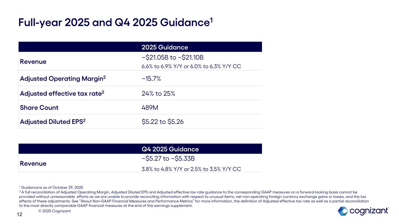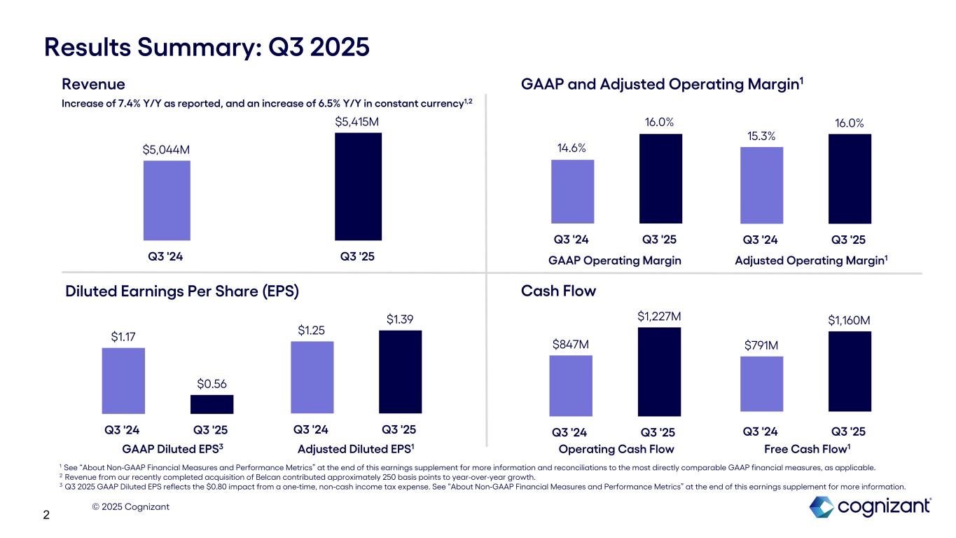 © 2025 Cognizant 1 Forward-looking statements This earnings supplement includes statements that may constitute forward-looking statements made pursuant to the safe harbor provisions of the Private Securities Litigation Reform Act of 1995, the accuracy of which is necessarily subject to risks, uncertainties and assumptions as to future events that may not prove to be accurate. These statements include, but are not limited to, express or implied forward-looking statements relating to our strategy, competitive position and opportunities in the marketplace, investment in and growth of our business, the pace and magnitude of change and client needs related to generative AI, the effectiveness of our recruiting and talent efforts and related costs, labor market trends, the anticipated amount of capital to be returned to shareholders and our anticipated financial performance, matters related to the Belcan acquisition and other statements regarding matters that are not historical facts. These statements are neither promises nor guarantees, but are subject to a variety of risks and uncertainties, many of which are beyond our control, which could cause actual results to differ materially from those contemplated in these forward-looking statements. Existing and prospective investors are cautioned not to place undue reliance on these forward-looking statements, which speak only as of the date hereof. Factors that could cause actual results to differ materially from those expressed or implied include general economic conditions, the competitive and rapidly changing nature of the markets we compete in, our ability to successfully use AI-based technologies and the impact those technologies may have on the demand and terms for our services, the competitive marketplace for talent and its impact on employee recruitment and retention, risks related to our NextGen program and the ultimate benefits of such program, legal, reputational and financial risks resulting from cyberattacks, changes in the regulatory environment, including with respect to immigration, trade and taxes and the other factors discussed in our most recent Annual Report on Form 10-K and other filings with the Securities and Exchange Commission. Cognizant undertakes no obligation to update or revise any forward-looking statements, whether as a result of new information, future events, or otherwise, except as may be required under applicable securities law.