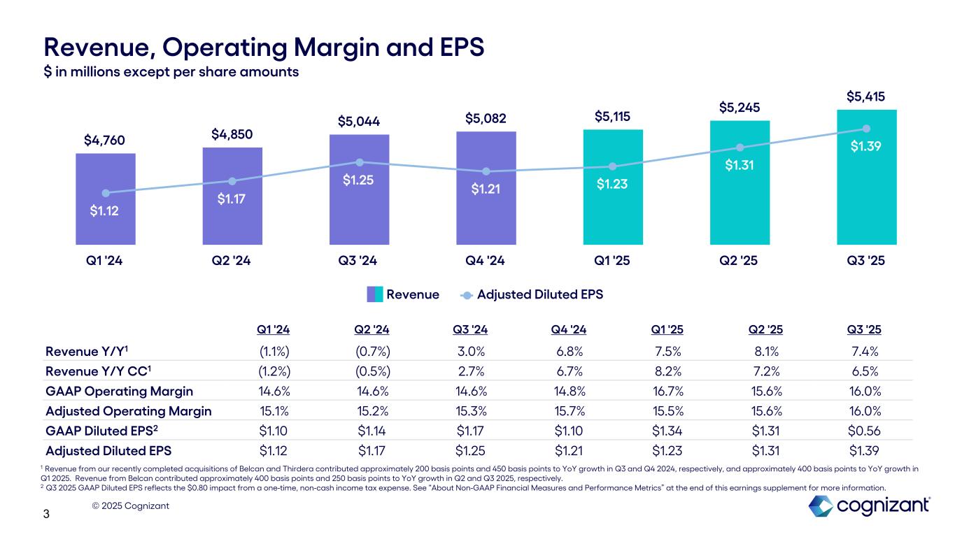 © 2025 Cognizant 2 $847M $1,227M Q3 '24 Q3 '25 Results Summary: Q3 2025 1 See “About Non-GAAP Financial Measures and Performance Metrics” at the end of this earnings supplement for more information and reconciliations to the most directly comparable GAAP financial measures, as applicable. 2 Revenue from our recently completed acquisition of Belcan contributed approximately 250 basis points to year-over-year growth. 3 Q3 2025 GAAP Diluted EPS reflects the $0.80 impact from a one-time, non-cash income tax expense. See “About Non-GAAP Financial Measures and Performance Metrics” at the end of this earnings supplement for more information. Revenue Increase of 7.4% Y/Y as reported, and an increase of 6.5% Y/Y in constant currency1,2 GAAP and Adjusted Operating Margin1 Cash Flow $5,044M $5,415M Q3 '24 Q3 '25 14.6% 16.0% Q3 '24 Q3 '25 15.3% 16.0% Q3 '24 Q3 '25 $791M $1,160M Q3 '24 Q3 '25 $1.17 $0.56 Q3 '24 Q3 '25 $1.25 $1.39 Q3 '24 Q3 '25 Adjusted Operating Margin1 GAAP Diluted EPS3 Adjusted Diluted EPS1 Operating Cash Flow Free Cash Flow1 GAAP Operating Margin Adjusted Operating Margin1 Diluted Earnings Per Share (EPS)