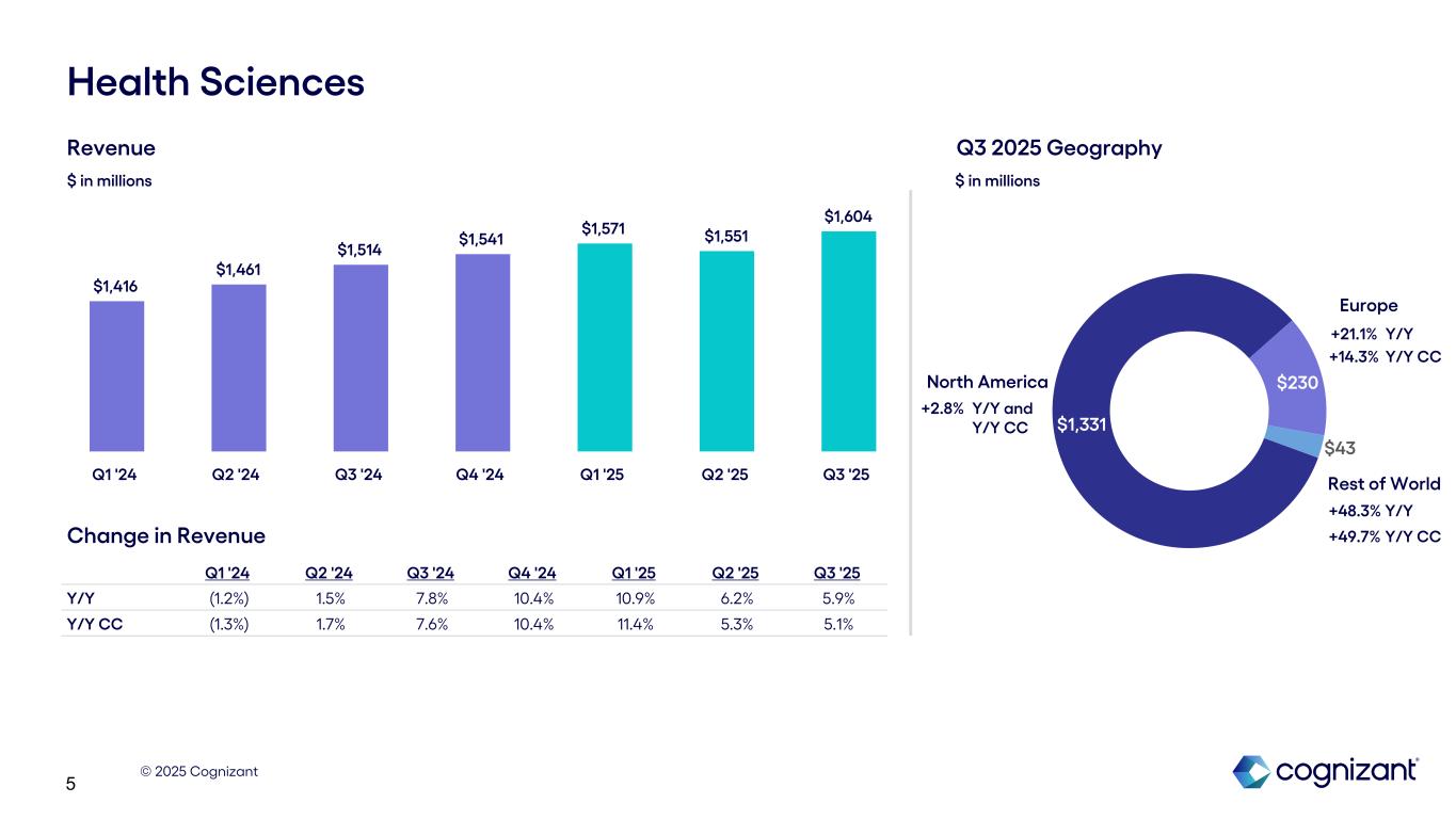 © 2025 Cognizant 4 $4,028 $1,042 $345 $1,578 $850 $1,383 $1,604 Revenue Performance: Q3 2025 Products & Resources1 Communications, Media & Technology Health Sciences Financial Services North America1 Europe Rest of World Segments $ in millions Geography $ in millions +4.2% Y/Y +3.6% Y/Y CC +12.6% Y/Y +11.4% Y/Y CC +5.9% Y/Y +5.1% Y/Y CC +6.2% Y/Y +5.4% Y/Y CC +7.8% Y/Y +2.7% Y/Y CC +0.9% Y/Y +2.6% Y/Y CC +7.8% Y/Y and Y/Y CC 1 Revenue from our recently completed acquisition of Belcan contributed approximately 9 percentage points to Products & Resources year-over-year growth in the third quarter of 2025, primarily in North America and to a lesser extent in the United Kingdom.