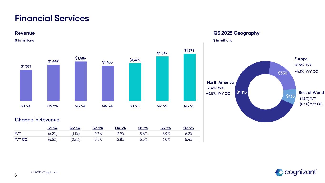 © 2025 Cognizant 5 $1,331 $230 $43 Health Sciences North America Europe Rest of World +48.3% Y/Y +49.7% Y/Y CC +21.1% Y/Y +14.3% Y/Y CC +2.8% Y/Y and Y/Y CC Revenue $ in millions Q1 '24 Q2 '24 Q3 '24 Q4 '24 Q1 '25 Q2 '25 Q3 '25 Y/Y (1.2%) 1.5% 7.8% 10.4% 10.9% 6.2% 5.9% Y/Y CC (1.3%) 1.7% 7.6% 10.4% 11.4% 5.3% 5.1% $1,416 $1,461 $1,514 $1,541 $1,571 $1,551 $1,604 Q1 '24 Q2 '24 Q3 '24 Q4 '24 Q1 '25 Q2 '25 Q3 '25 Change in Revenue $ in millions Q3 2025 Geography