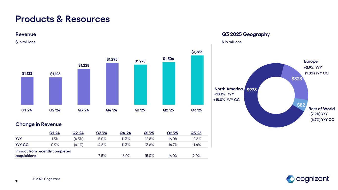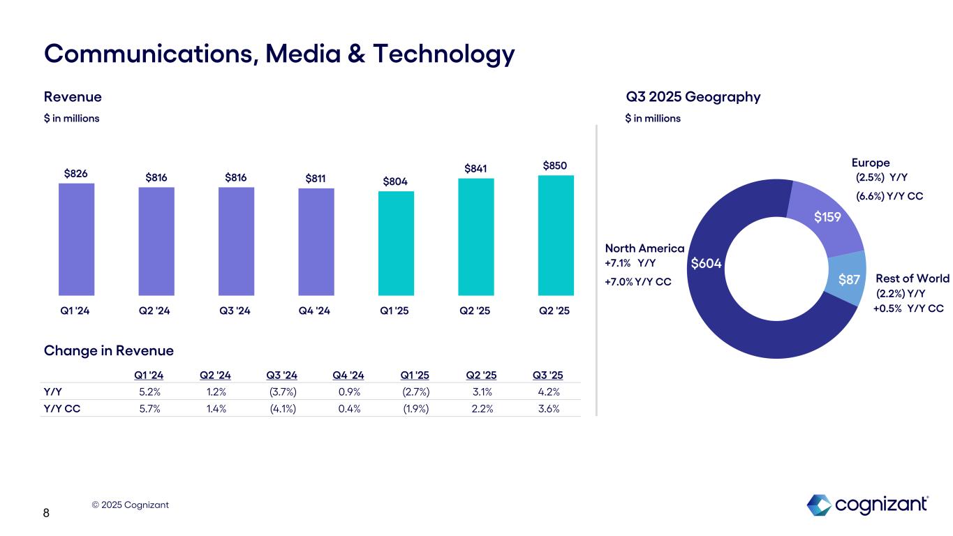 © 2025 Cognizant 7 $978 $323 $82 North America Europe Products & Resources +18.1% Y/Y +18.0% Y/Y CC +3.9% Y/Y (1.0%) Y/Y CC (7.9%) Y/Y (6.7%) Y/Y CC Rest of World Revenue $ in millions Q1 '24 Q2 '24 Q3 '24 Q4 '24 Q1 '25 Q2 '25 Q3 '25 Y/Y 1.3% (4.3%) 5.0% 11.3% 12.8% 16.0% 12.6% Y/Y CC 0.9% (4.1%) 4.6% 11.3% 13.6% 14.7% 11.4% Impact from recently completed acquisitions 7.5% 16.0% 15.0% 16.0% 9.0% $1,133 $1,126 $1,228 $1,295 $1,278 $1,306 $1,383 Q1 '24 Q2 '24 Q3 '24 Q4 '24 Q1 '25 Q2 '25 Q3 '25 Change in Revenue $ in millions Q3 2025 Geography