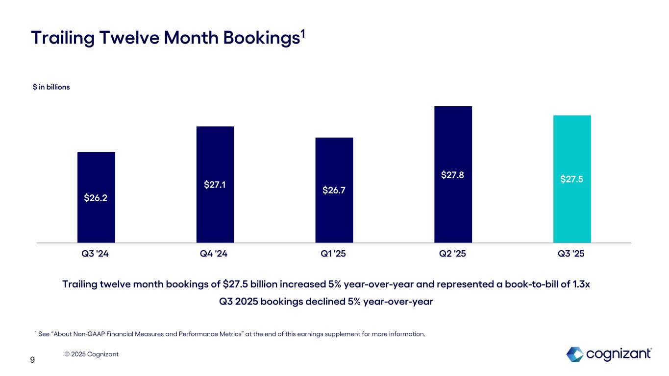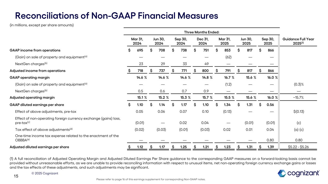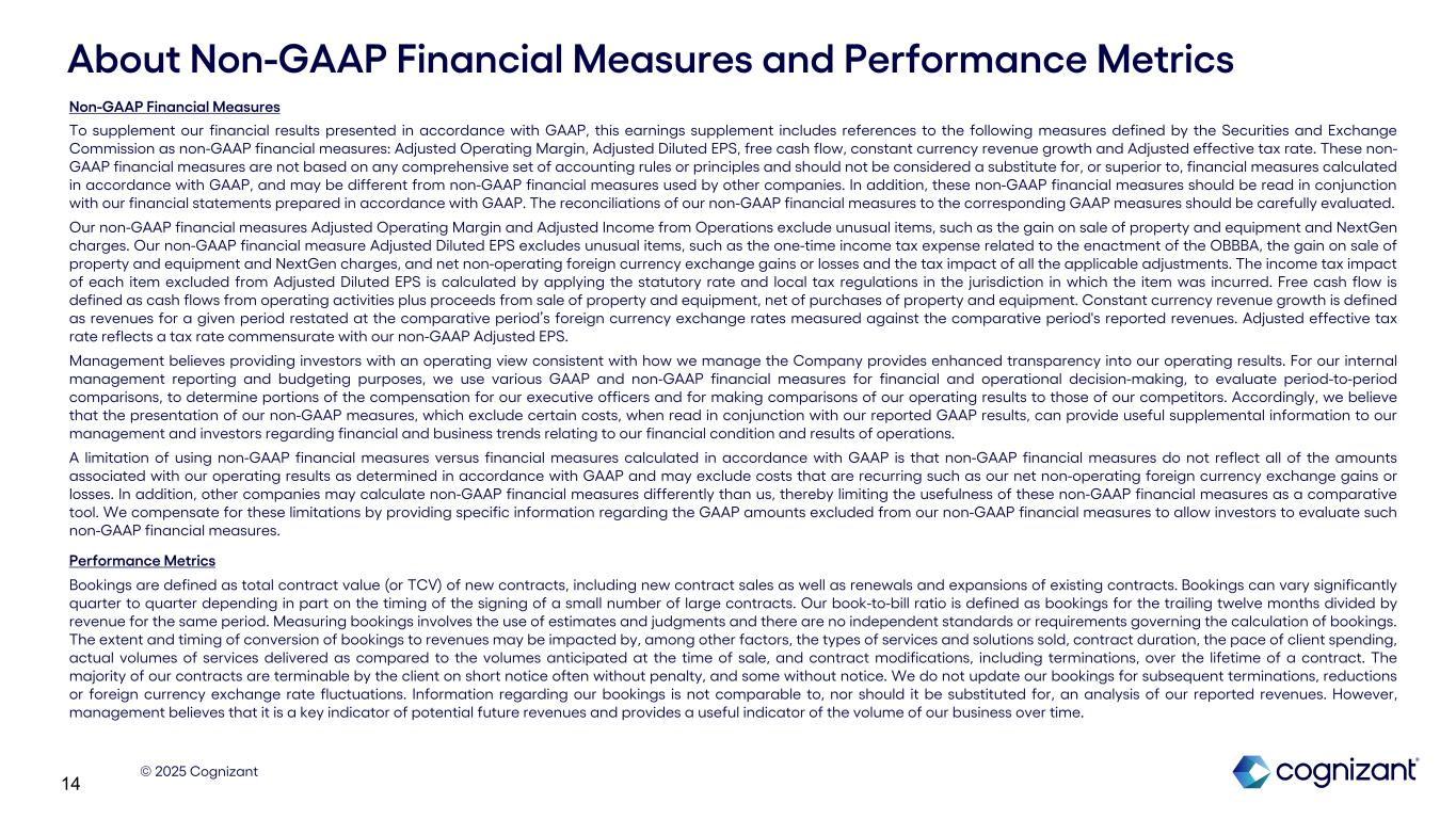 © 2025 Cognizant 14 Non-GAAP Financial Measures To supplement our financial results presented in accordance with GAAP, this earnings supplement includes references to the following measures defined by the Securities and Exchange Commission as non-GAAP financial measures: Adjusted Operating Margin, Adjusted Diluted EPS, free cash flow, constant currency revenue growth and Adjusted effective tax rate. These non- GAAP financial measures are not based on any comprehensive set of accounting rules or principles and should not be considered a substitute for, or superior to, financial measures calculated in accordance with GAAP, and may be different from non-GAAP financial measures used by other companies. In addition, these non-GAAP financial measures should be read in conjunction with our financial statements prepared in accordance with GAAP. The reconciliations of our non-GAAP financial measures to the corresponding GAAP measures should be carefully evaluated. Our non-GAAP financial measures Adjusted Operating Margin and Adjusted Income from Operations exclude unusual items, such as the gain on sale of property and equipment and NextGen charges. Our non-GAAP financial measure Adjusted Diluted EPS excludes unusual items, such as the one-time income tax expense related to the enactment of the OBBBA, the gain on sale of property and equipment and NextGen charges, and net non-operating foreign currency exchange gains or losses and the tax impact of all the applicable adjustments. The income tax impact of each item excluded from Adjusted Diluted EPS is calculated by applying the statutory rate and local tax regulations in the jurisdiction in which the item was incurred. Free cash flow is defined as cash flows from operating activities plus proceeds from sale of property and equipment, net of purchases of property and equipment. Constant currency revenue growth is defined as revenues for a given period restated at the comparative period’s foreign currency exchange rates measured against the comparative period's reported revenues. Adjusted effective tax rate reflects a tax rate commensurate with our non-GAAP Adjusted EPS. Management believes providing investors with an operating view consistent with how we manage the Company provides enhanced transparency into our operating results. For our internal management reporting and budgeting purposes, we use various GAAP and non-GAAP financial measures for financial and operational decision-making, to evaluate period-to-period comparisons, to determine portions of the compensation for our executive officers and for making comparisons of our operating results to those of our competitors. Accordingly, we believe that the presentation of our non-GAAP measures, which exclude certain costs, when read in conjunction with our reported GAAP results, can provide useful supplemental information to our management and investors regarding financial and business trends relating to our financial condition and results of operations. A limitation of using non-GAAP financial measures versus financial measures calculated in accordance with GAAP is that non-GAAP financial measures do not reflect all of the amounts associated with our operating results as determined in accordance with GAAP and may exclude costs that are recurring such as our net non-operating foreign currency exchange gains or losses. In addition, other companies may calculate non-GAAP financial measures differently than us, thereby limiting the usefulness of these non-GAAP financial measures as a comparative tool. We compensate for these limitations by providing specific information regarding the GAAP amounts excluded from our non-GAAP financial measures to allow investors to evaluate such non-GAAP financial measures. Performance Metrics Bookings are defined as total contract value (or TCV) of new contracts, including new contract sales as well as renewals and expansions of existing contracts. Bookings can vary significantly quarter to quarter depending in part on the timing of the signing of a small number of large contracts. Our book-to-bill ratio is defined as bookings for the trailing twelve months divided by revenue for the same period. Measuring bookings involves the use of estimates and judgments and there are no independent standards or requirements governing the calculation of bookings. The extent and timing of conversion of bookings to revenues may be impacted by, among other factors, the types of services and solutions sold, contract duration, the pace of client spending, actual volumes of services delivered as compared to the volumes anticipated at the time of sale, and contract modifications, including terminations, over the lifetime of a contract. The majority of our contracts are terminable by the client on short notice often without penalty, and some without notice. We do not update our bookings for subsequent terminations, reductions or foreign currency exchange rate fluctuations. Information regarding our bookings is not comparable to, nor should it be substituted for, an analysis of our reported revenues. However, management believes that it is a key indicator of potential future revenues and provides a useful indicator of the volume of our business over time. About Non-GAAP Financial Measures and Performance Metrics