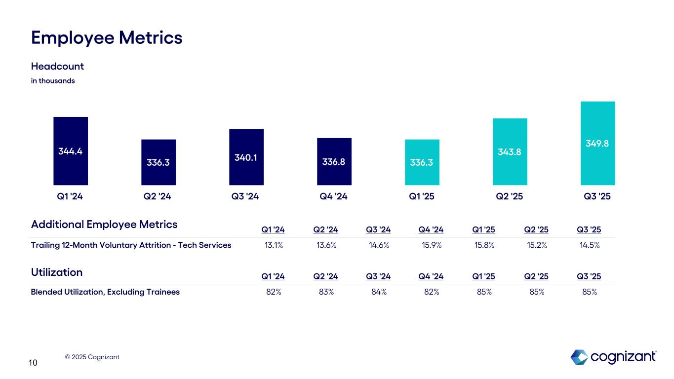 © 2025 Cognizant 10 Employee Metrics 344.4 336.3 340.1 336.8 336.3 343.8 349.8 Q1 '24 Q2 '24 Q3 '24 Q4 '24 Q1 '25 Q2 '25 Q3 '25 Q1 '24 Q2 '24 Q3 '24 Q4 '24 Q1 '25 Q2 '25 Q3 '25 Trailing 12-Month Voluntary Attrition - Tech Services 13.1% 13.6% 14.6% 15.9% 15.8% 15.2% 14.5% Additional Employee Metrics Q1 '24 Q2 '24 Q3 '24 Q4 '24 Q1 '25 Q2 '25 Q3 '25 Blended Utilization, Excluding Trainees 82% 83% 84% 82% 85% 85% 85% Utilization Headcount in thousands