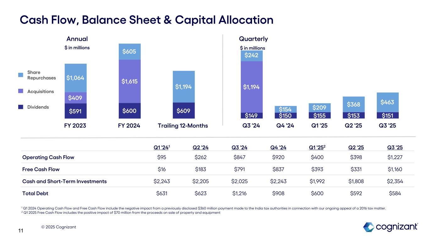 © 2025 Cognizant 17 Reconciliations of Non-GAAP Financial Measures Reconciliation of free cash flow Three Months Ended (in millions) Mar 31, 2024 Jun 30, 2024 Sep 30, 2024 Dec 31, 2024 Mar 31, 2025 Jun 30, 2025 Sep 30, 2025 Net cash provided by operating activities $ 95 $ 262 $ 847 $ 920 $ 400 $ 398 $ 1,227 Purchases of property and equipment (79) (79) (56) (83) (77) (67) (67) Proceeds from sale of property and equipment — — — — 70 — — Free cash flow $ 16 $ 183 $ 791 $ 837 $ 393 $ 331 $ 1,160 Adjusted Effective Tax Rate Reconciliation Guidance FY 2025 GAAP effective tax rate Effect of non-operating foreign currency exchange (gains) losses (c) (c) Effect of the gain on sale of property and equipment (a) — One-time income tax expense related to the enactment of the OBBBA(e) ~(12)% Adjusted effective tax rate 24% - 25% The notes referenced in the above table are located on page 16. Net Interest FY 2024 Guidance FY 2025 Interest income $78 ~$115 Interest expense (29) (~50) Net Interest Income $49 ~ Adjusted Net Income Reconciliation (in millions) Q3 2025 YTD 2025 GAAP net income $ 274 $ 1,582 Non-operating foreign currency exchange gains / losses (c) 11 12 (Gain) on sale of property and equipment (a) — (53) One-time income tax expense related to the enactment of the OBBBA(e) 390 390 Adjusted Net Income $ 675 $ 1,931