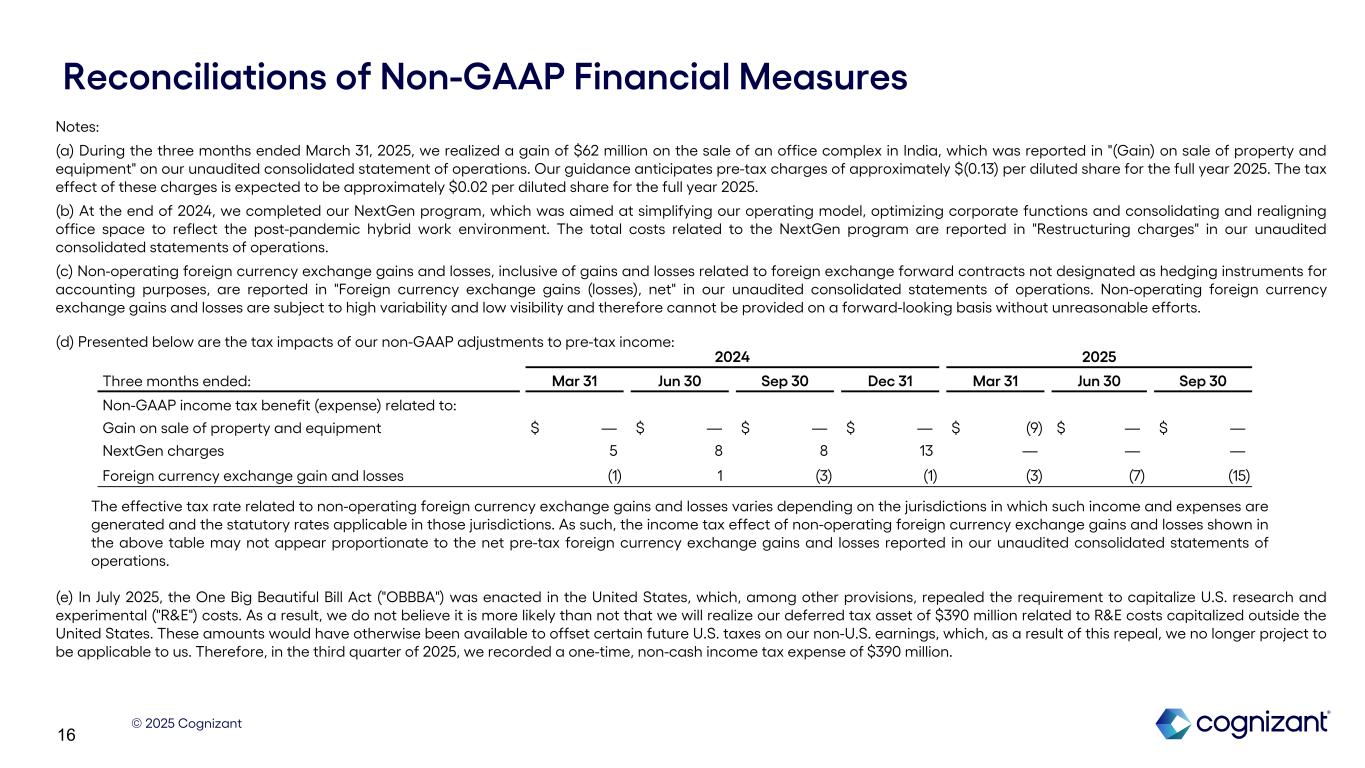 © 2025 Cognizant 15 Reconciliations of Non-GAAP Financial Measures Please refer to page 16 of this earnings supplement for corresponding Non-GAAP notes. (in millions, except per share amounts) Three Months Ended: Mar 31, 2024 Jun 30, 2024 Sep 30, 2024 Dec 31, 2024 Mar 31, 2025 Jun 30, 2025 Sep 30, 2025 Guidance Full Year 2025(1) GAAP income from operations $ 695 $ 708 $ 738 $ 751 $ 853 $ 817 $ 866 (Gain) on sale of property and equipment(a) — — — — (62) — — NextGen charges(b) 23 29 33 49 — — — Adjusted income from operations $ 718 $ 737 $ 771 $ 800 $ 791 $ 817 $ 866 GAAP operating margin 14.6 % 14.6 % 14.6 % 14.8 % 16.7 % 15.6 % 16.0 % (Gain) on sale of property and equipment(a) — — — — (1.2) — — (0.3)% NextGen charges(b) 0.5 0.6 0.7 0.9 — — — — Adjusted operating margin 15.1 % 15.2 % 15.3 % 15.7 % 15.5 % 15.6 % 16.0 % ~15.7% GAAP diluted earnings per share $ 1.10 $ 1.14 $ 1.17 $ 1.10 $ 1.34 $ 1.31 $ 0.56 Effect of above adjustments, pre-tax 0.05 0.06 0.07 0.10 (0.13) — — $(0.13) Effect of non-operating foreign currency exchange (gains) loss, pre-tax(c) (0.01) — 0.02 0.04 — (0.01) (0.01) (c) Tax effect of above adjustments(d) (0.02) (0.03) (0.01) (0.03) 0.02 0.01 0.04 (a) (c) One-time income tax expense related to the enactment of the OBBBA(e) — — — — — — 0.80 0.80 Adjusted diluted earnings per share $ 1.12 $ 1.17 $ 1.25 $ 1.21 $ 1.23 $ 1.31 $ 1.39 $5.22 - $5.26 (1) A full reconciliation of Adjusted Operating Margin and Adjusted Diluted Earnings Per Share guidance to the corresponding GAAP measures on a forward-looking basis cannot be provided without unreasonable efforts, as we are unable to provide reconciling information with respect to unusual items, net non-operating foreign currency exchange gains or losses and the tax effects of these adjustments, and such adjustments may be significant.