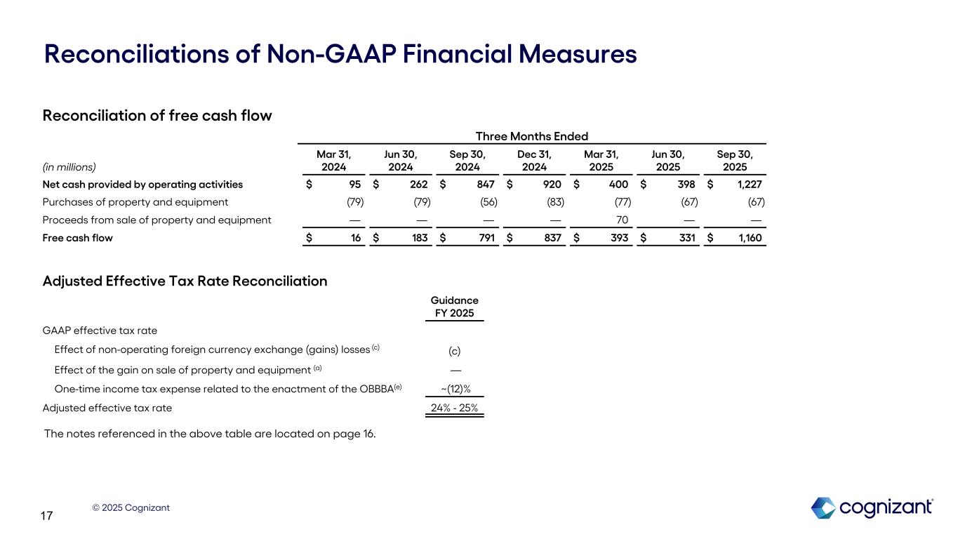 © 2025 Cognizant 16 Reconciliations of Non-GAAP Financial Measures Notes: (a) During the three months ended March 31, 2025, we realized a gain of $62 million on the sale of an office complex in India, which was reported in "(Gain) on sale of property and equipment" on our unaudited consolidated statement of operations. Our guidance anticipates pre-tax charges of approximately $(0.13) per diluted share for the full year 2025. The tax effect of these charges is expected to be approximately $0.02 per diluted share for the full year 2025. (b) At the end of 2024, we completed our NextGen program, which was aimed at simplifying our operating model, optimizing corporate functions and consolidating and realigning office space to reflect the post-pandemic hybrid work environment. The total costs related to the NextGen program are reported in "Restructuring charges" in our unaudited consolidated statements of operations. (c) Non-operating foreign currency exchange gains and losses, inclusive of gains and losses related to foreign exchange forward contracts not designated as hedging instruments for accounting purposes, are reported in "Foreign currency exchange gains (losses), net" in our unaudited consolidated statements of operations. Non-operating foreign currency exchange gains and losses are subject to high variability and low visibility and therefore cannot be provided on a forward-looking basis without unreasonable efforts. 2024 2025 Three months ended: Mar 31 Jun 30 Sep 30 Dec 31 Mar 31 Jun 30 Sep 30 Non-GAAP income tax benefit (expense) related to: Gain on sale of property and equipment $ — $ — $ — $ — $ (9) $ — $ — NextGen charges 5 8 8 13 — — — Foreign currency exchange gain and losses (1) 1 (3) (1) (3) (7) (15) (d) Presented below are the tax impacts of our non-GAAP adjustments to pre-tax income: The effective tax rate related to non-operating foreign currency exchange gains and losses varies depending on the jurisdictions in which such income and expenses are generated and the statutory rates applicable in those jurisdictions. As such, the income tax effect of non-operating foreign currency exchange gains and losses shown in the above table may not appear proportionate to the net pre-tax foreign currency exchange gains and losses reported in our unaudited consolidated statements of operations. (e) In July 2025, the One Big Beautiful Bill Act ("OBBBA") was enacted in the United States, which, among other provisions, repealed the requirement to capitalize U.S. research and experimental ("R&E") costs. As a result, we do not believe it is more likely than not that we will realize our deferred tax asset of $390 million related to R&E costs capitalized outside the United States. These amounts would have otherwise been available to offset certain future U.S. taxes on our non-U.S. earnings, which, as a result of this repeal, we no longer project to be applicable to us. Therefore, in the third quarter of 2025, we recorded a one-time, non-cash income tax expense of $390 million.
