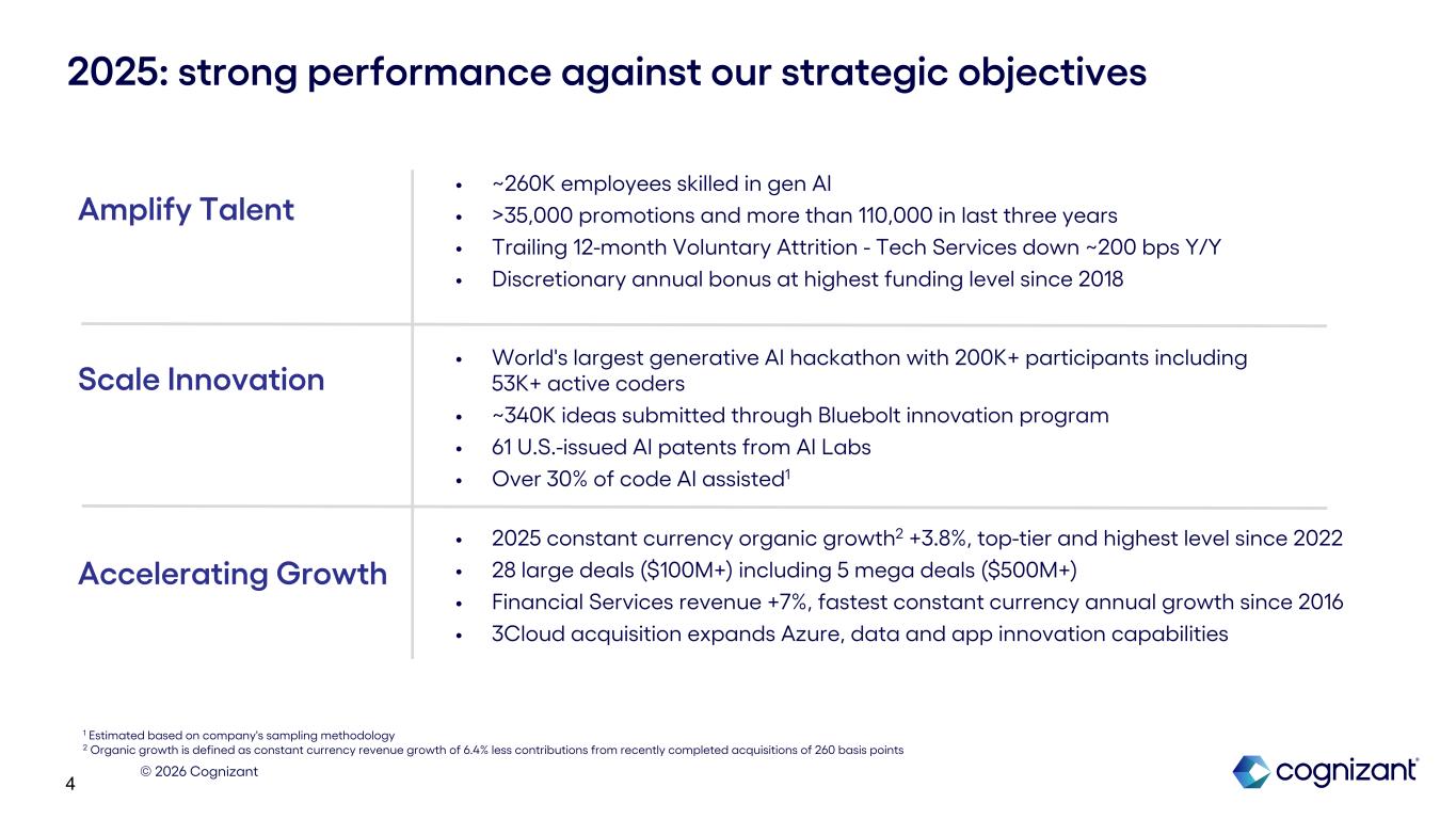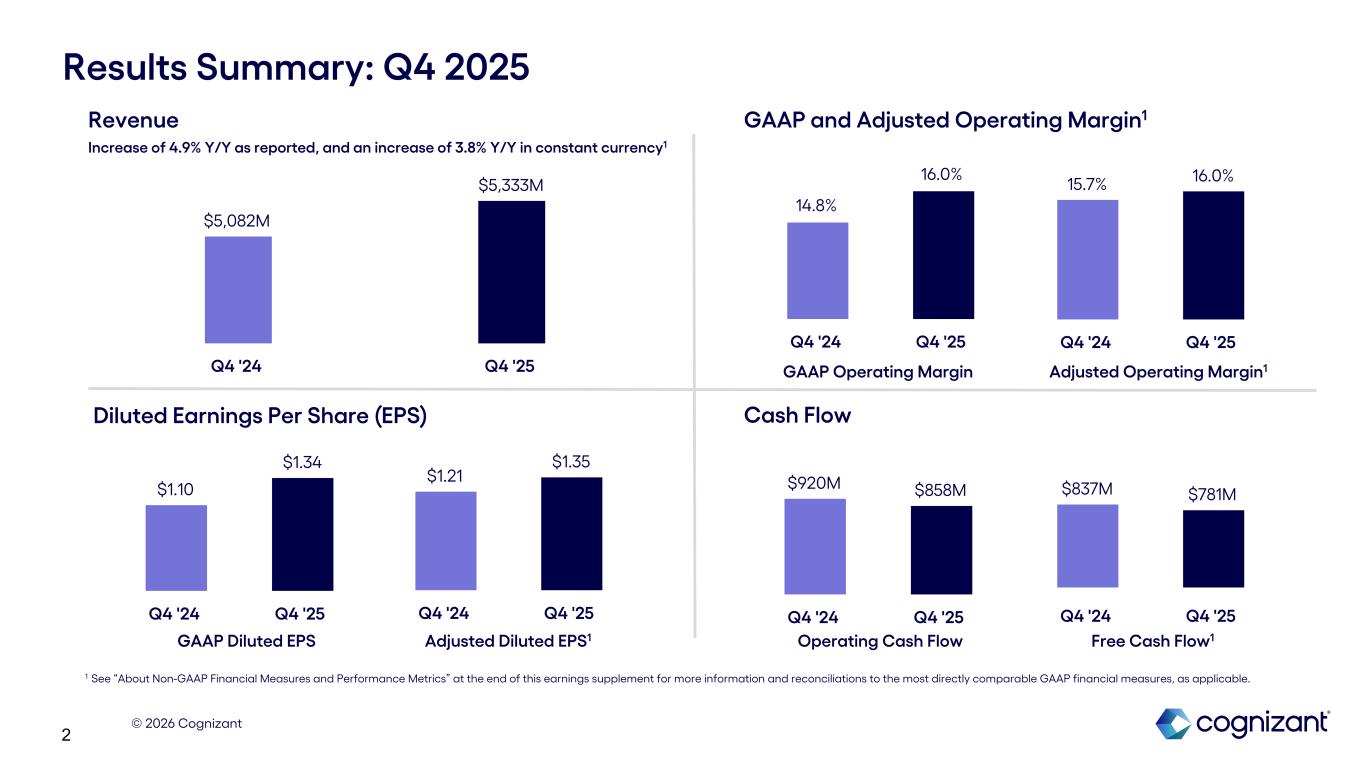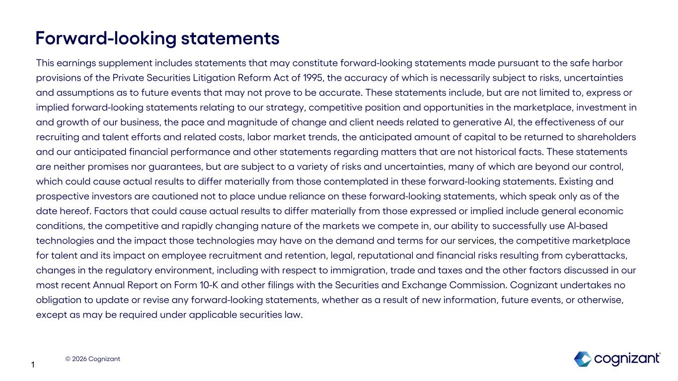 © 2026 Cognizant 1 Forward-looking statements This earnings supplement includes statements that may constitute forward-looking statements made pursuant to the safe harbor provisions of the Private Securities Litigation Reform Act of 1995, the accuracy of which is necessarily subject to risks, uncertainties and assumptions as to future events that may not prove to be accurate. These statements include, but are not limited to, express or implied forward-looking statements relating to our strategy, competitive position and opportunities in the marketplace, investment in and growth of our business, the pace and magnitude of change and client needs related to generative AI, the effectiveness of our recruiting and talent efforts and related costs, labor market trends, the anticipated amount of capital to be returned to shareholders and our anticipated financial performance and other statements regarding matters that are not historical facts. These statements are neither promises nor guarantees, but are subject to a variety of risks and uncertainties, many of which are beyond our control, which could cause actual results to differ materially from those contemplated in these forward-looking statements. Existing and prospective investors are cautioned not to place undue reliance on these forward-looking statements, which speak only as of the date hereof. Factors that could cause actual results to differ materially from those expressed or implied include general economic conditions, the competitive and rapidly changing nature of the markets we compete in, our ability to successfully use AI-based technologies and the impact those technologies may have on the demand and terms for our services, the competitive marketplace for talent and its impact on employee recruitment and retention, legal, reputational and financial risks resulting from cyberattacks, changes in the regulatory environment, including with respect to immigration, trade and taxes and the other factors discussed in our most recent Annual Report on Form 10-K and other filings with the Securities and Exchange Commission. Cognizant undertakes no obligation to update or revise any forward-looking statements, whether as a result of new information, future events, or otherwise, except as may be required under applicable securities law.