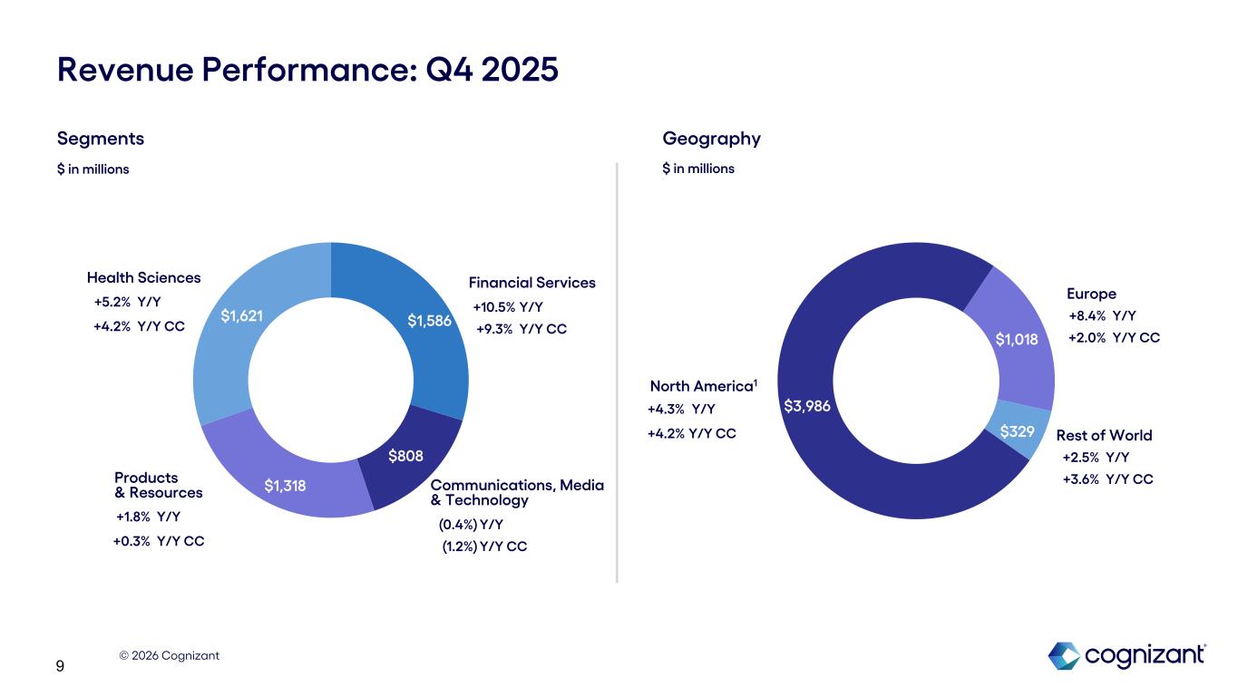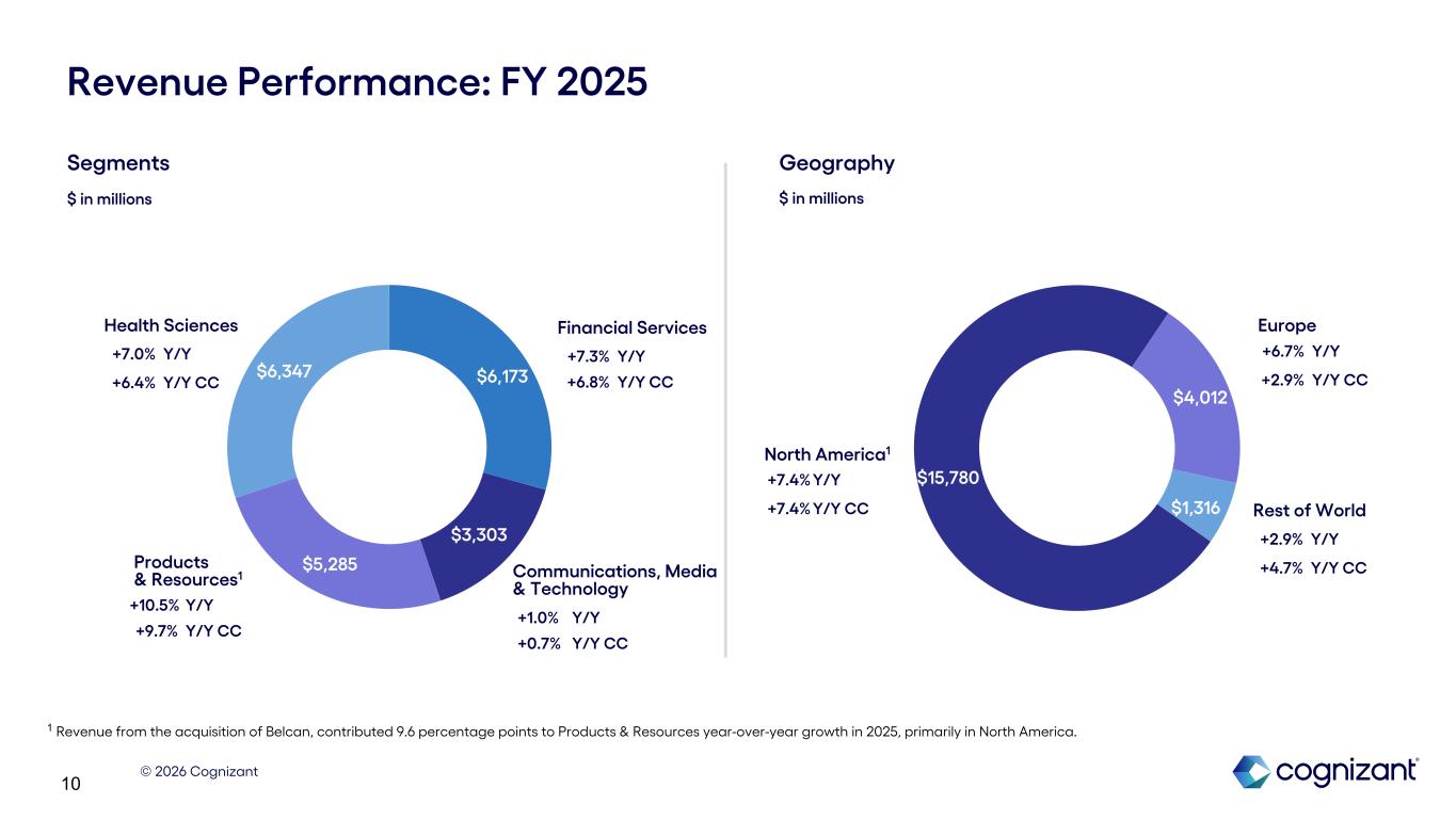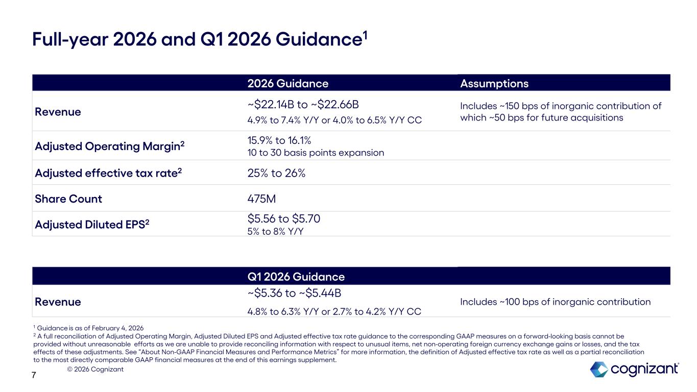 © 2026 Cognizant 1 Forward-looking statements This earnings supplement includes statements that may constitute forward-looking statements made pursuant to the safe harbor provisions of the Private Securities Litigation Reform Act of 1995, the accuracy of which is necessarily subject to risks, uncertainties and assumptions as to future events that may not prove to be accurate. These statements include, but are not limited to, express or implied forward-looking statements relating to our strategy, competitive position and opportunities in the marketplace, investment in and growth of our business, the pace and magnitude of change and client needs related to generative AI, the effectiveness of our recruiting and talent efforts and related costs, labor market trends, the anticipated amount of capital to be returned to shareholders and our anticipated financial performance and other statements regarding matters that are not historical facts. These statements are neither promises nor guarantees, but are subject to a variety of risks and uncertainties, many of which are beyond our control, which could cause actual results to differ materially from those contemplated in these forward-looking statements. Existing and prospective investors are cautioned not to place undue reliance on these forward-looking statements, which speak only as of the date hereof. Factors that could cause actual results to differ materially from those expressed or implied include general economic conditions, the competitive and rapidly changing nature of the markets we compete in, our ability to successfully use AI-based technologies and the impact those technologies may have on the demand and terms for our services, the competitive marketplace for talent and its impact on employee recruitment and retention, legal, reputational and financial risks resulting from cyberattacks, changes in the regulatory environment, including with respect to immigration, trade and taxes and the other factors discussed in our most recent Annual Report on Form 10-K and other filings with the Securities and Exchange Commission. Cognizant undertakes no obligation to update or revise any forward-looking statements, whether as a result of new information, future events, or otherwise, except as may be required under applicable securities law.