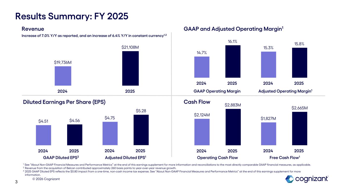 © 2026 Cognizant 2 $920M $858M Q4 '24 Q4 '25 Results Summary: Q4 2025 1 See “About Non-GAAP Financial Measures and Performance Metrics” at the end of this earnings supplement for more information and reconciliations to the most directly comparable GAAP financial measures, as applicable. Revenue Increase of 4.9% Y/Y as reported, and an increase of 3.8% Y/Y in constant currency1 GAAP and Adjusted Operating Margin1 Cash Flow $5,082M $5,333M Q4 '24 Q4 '25 14.8% 16.0% Q4 '24 Q4 '25 15.7% 16.0% Q4 '24 Q4 '25 $837M $781M Q4 '24 Q4 '25 $1.10 $1.34 Q4 '24 Q4 '25 $1.21 $1.35 Q4 '24 Q4 '25 Adjusted Operating Margin1 GAAP Diluted EPS Adjusted Diluted EPS1 Operating Cash Flow Free Cash Flow1 GAAP Operating Margin Adjusted Operating Margin1 Diluted Earnings Per Share (EPS)