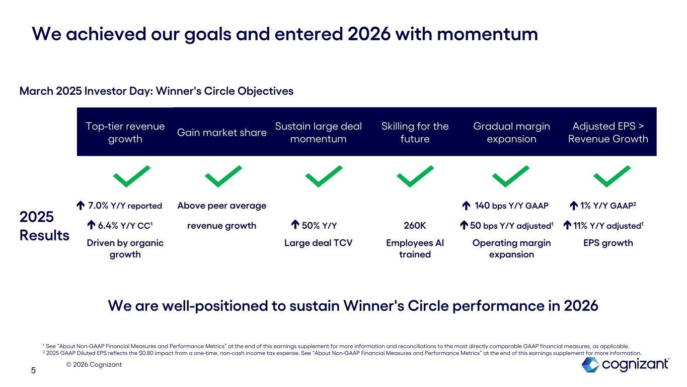 © 2026 Cognizant 4 • World's largest generative AI hackathon with 200K+ participants including 53K+ active coders • ~340K ideas submitted through Bluebolt innovation program • 61 U.S.-issued AI patents from AI Labs • Over 30% of code AI assisted1 2025: strong performance against our strategic objectives Amplify Talent Adjusted Operating Margin1 Scale Innovation Accelerating Growth • ~260K employees skilled in gen AI • >35,000 promotions and more than 110,000 in last three years • Trailing 12-month Voluntary Attrition - Tech Services down ~200 bps Y/Y • Discretionary annual bonus at highest funding level since 2018 • 2025 constant currency organic growth2 +3.8%, top-tier and highest level since 2022 • 28 large deals ($100M+) including 5 mega deals ($500M+) • Financial Services revenue +7%, fastest constant currency annual growth since 2016 • 3Cloud acquisition expands Azure, data and app innovation capabilities 1 Estimated based on company's sampling methodology 2 Organic growth is defined as constant currency revenue growth of 6.4% less contributions from recently completed acquisitions of 260 basis points