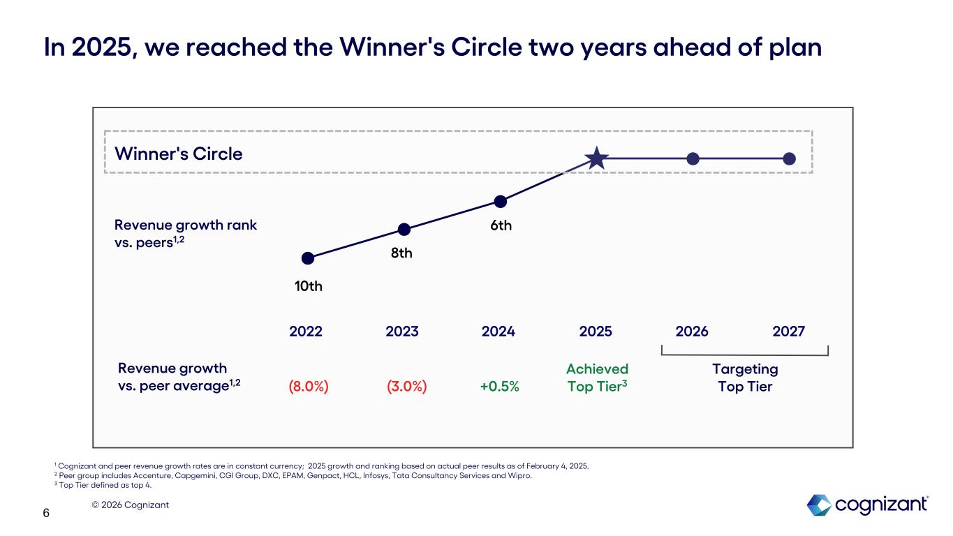 © 2026 Cognizant 5 March 2025 Investor Day: Winner's Circle Objectives Top-tier revenue growth Gain market share Sustain large deal momentum Skilling for the future Gradual margin expansion Adjusted EPS > Revenue Growth 2025 Results 7.0% Y/Y reported Above peer average 140 bps Y/Y GAAP 1% Y/Y GAAP2 6.4% Y/Y CC1 revenue growth 50% Y/Y 260K 50 bps Y/Y adjusted1 11% Y/Y adjusted1 Driven by organic growth Large deal TCV Employees AI trained Operating margin expansion EPS growth We achieved our goals and entered 2026 with momentum 1 See “About Non-GAAP Financial Measures and Performance Metrics” at the end of this earnings supplement for more information and reconciliations to the most directly comparable GAAP financial measures, as applicable. 2 2025 GAAP Diluted EPS reflects the $0.80 impact from a one-time, non-cash income tax expense. See “About Non-GAAP Financial Measures and Performance Metrics” at the end of this earnings supplement for more information. Adjusted Operating Margin1 We are well-positioned to sustain Winner's Circle performance in 2026 é é é é é é éé