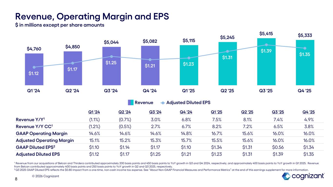 © 2026 Cognizant 3 Results Summary: FY 2025 Revenue Increase of 7.0% Y/Y as reported, and an increase of 6.4% Y/Y in constant currency1,2 GAAP and Adjusted Operating Margin1 $19,736M $21,108M 2024 2025 14.7% 16.1% 2024 2025 15.3% 15.8% 2024 2025 $2,124M $2,883M 2024 2025 $1,827M $2,665M 2024 2025 $4.51 $4.56 2024 2025 $4.75 $5.28 2024 2025 Adjusted Operating Margin1 GAAP Diluted EPS3 Adjusted Diluted EPS1 Operating Cash Flow Free Cash Flow1 GAAP Operating Margin Adjusted Operating Margin1 1 See “About Non-GAAP Financial Measures and Performance Metrics” at the end of this earnings supplement for more information and reconciliations to the most directly comparable GAAP financial measures, as applicable. 2 Revenue from the acquisition of Belcan contributed approximately 260 basis points to year-over-year revenue growth. 3 2025 GAAP Diluted EPS reflects the $0.80 impact from a one-time, non-cash income tax expense. See “About Non-GAAP Financial Measures and Performance Metrics” at the end of this earnings supplement for more information. Diluted Earnings Per Share (EPS) Cash Flow