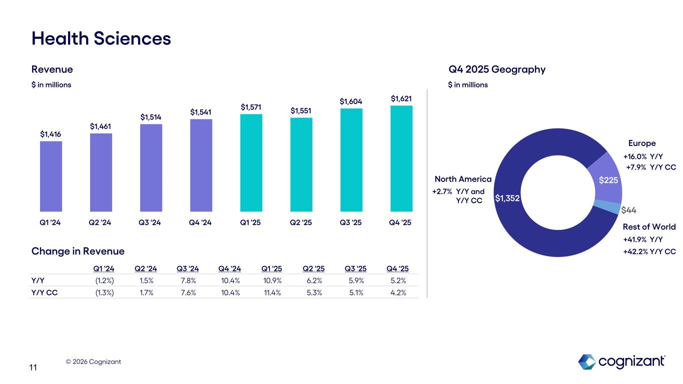 © 2026 Cognizant 10 +2.9% Y/Y +4.7% Y/Y CC $15,780 $4,012 $1,316 $6,173 $3,303 $5,285 $6,347 Revenue Performance: FY 2025 Products & Resources1 Communications, Media & Technology Health Sciences Financial Services North America1 Europe Rest of World Segments $ in millions Geography $ in millions +1.0% Y/Y +0.7% Y/Y CC +10.5% Y/Y +9.7% Y/Y CC +7.0% Y/Y +6.4% Y/Y CC +7.3% Y/Y +6.8% Y/Y CC +6.7% Y/Y +2.9% Y/Y CC +7.4% Y/Y +7.4% Y/Y CC 1 Revenue from the acquisition of Belcan, contributed 9.6 percentage points to Products & Resources year-over-year growth in 2025, primarily in North America.